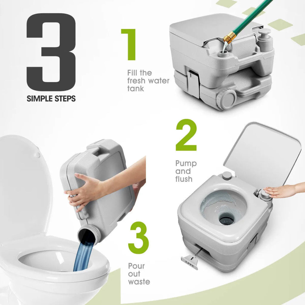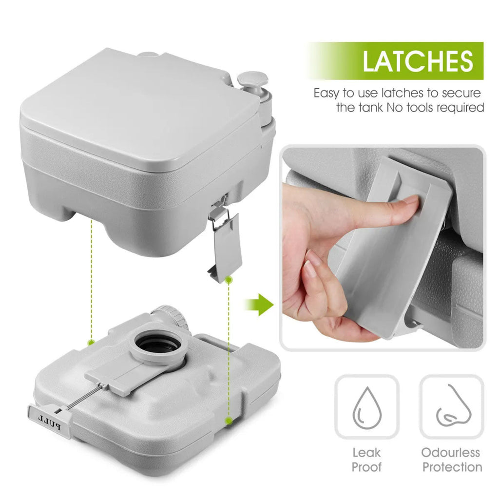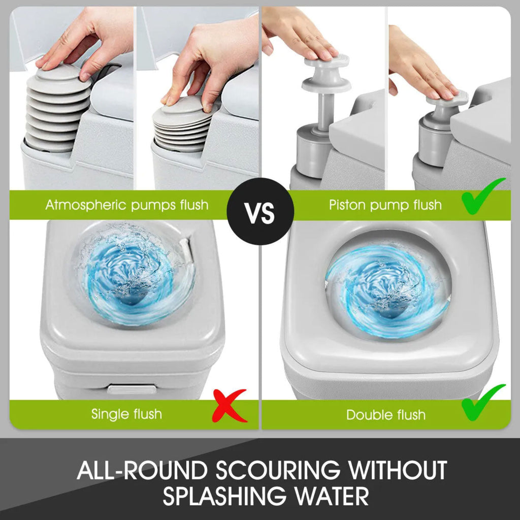 Make your journey worry-free with this 10L Portable Toilet Camping Travel Mobile Porta Potty. Thanks to the high-density polyethylene structure, the travel potty is lightweight yet sturdy for years of use. Completely self-contained, this travel toilet does not require any external water or power supply. Adopting piston pump flush and double flush designs, the portable toilet for camping is composed of a 12L fresh water tank to provide up to 50 times of thorough flushes and a 10L waste holding tank which is easily detached and emptied. A double-sealed drain valve is included to prevent leakage and odour. Compact and easy to transport, the mobile toilet boasts of impressive versatility and amazing practicality so that it can not only be used for camping, off-road driving, fishing and boating but also used as an emergency toilet for hospitals and aged care spots. The best portable toilet is ideal for all seasons and detachable for easy storage and cleaning.