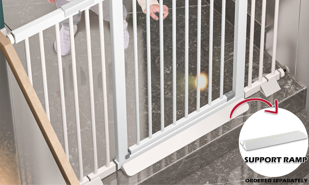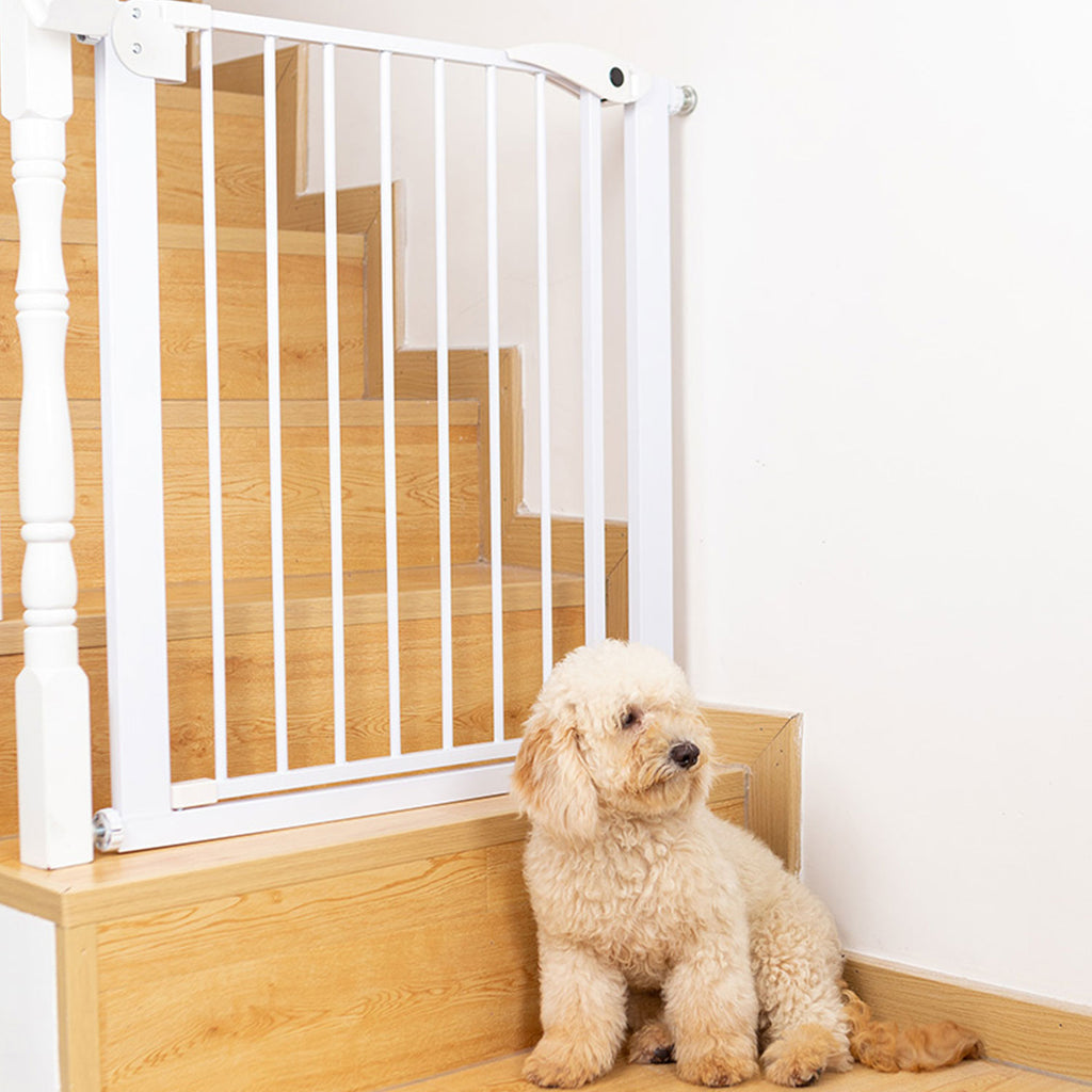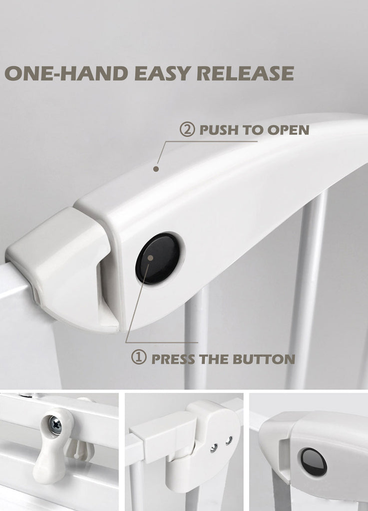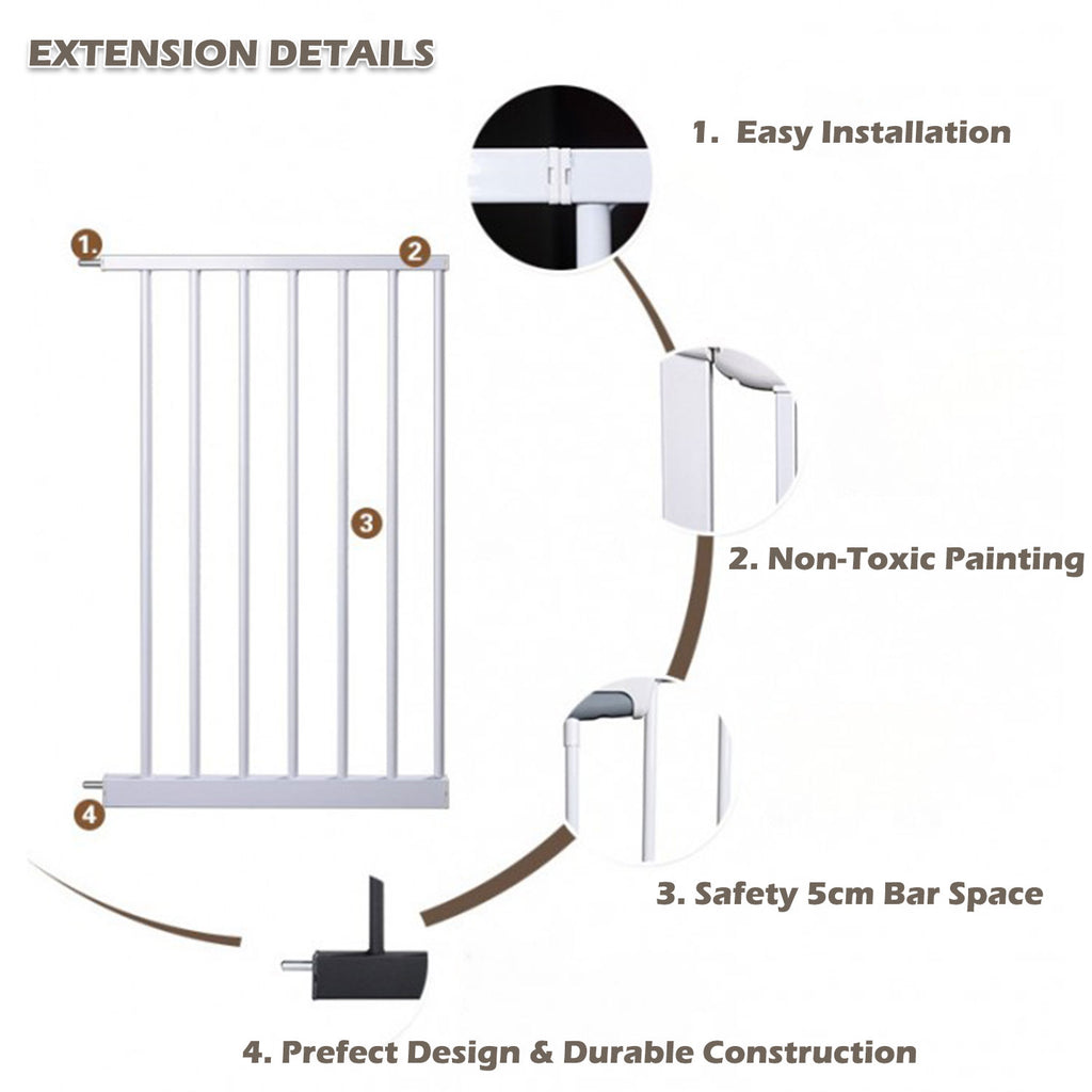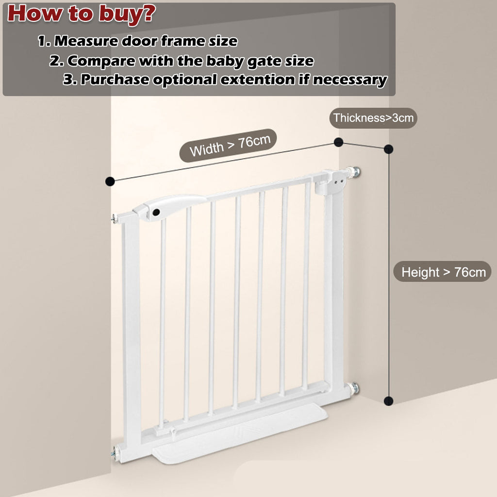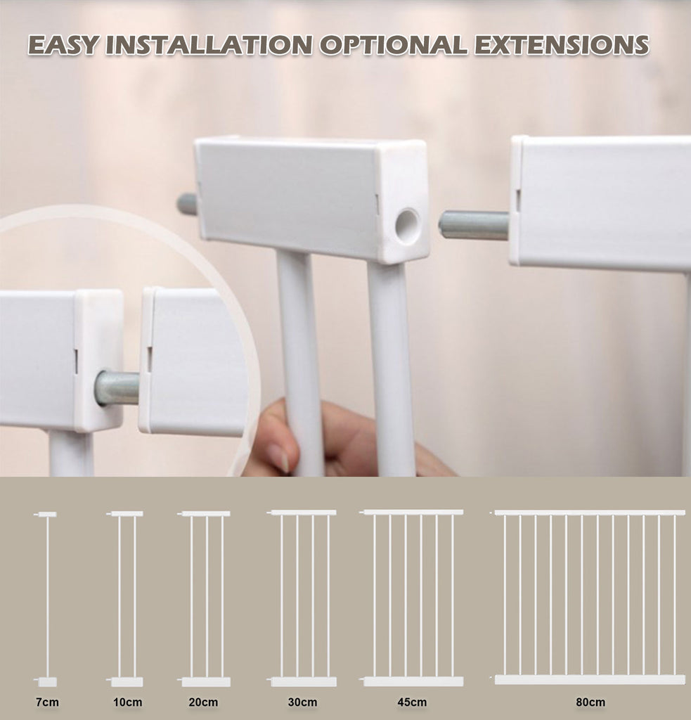 Child Pet Safety Gates Adjustable Baby Gate will be a competent helper to prevent your kids and pets from danger when you are cooking, reading or doing housework. Featuring 76cm height and 75cm to 82cm width, with optional extensions in different sizes (7cm, 10cm, 20cm, 30cm, 45cm,80cm), this child safety gates can be set up with ease in the dining room, stairs or aisles etc. With the automatic opening and closing system, this baby gate allows you to operate easily in or out of the door but not your little ones. Equipped with 2 step pass, the wide baby gate allows you can come in and go out much more conveniently and safely. Build in durable and sturdy metal material, the gate adds another level of protection. What are you waiting for? The kids safety gates are doomed to be your decent selection