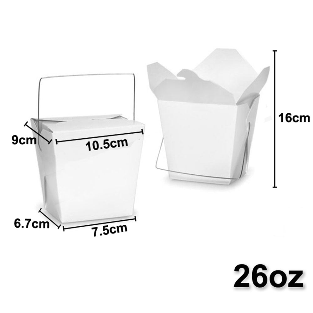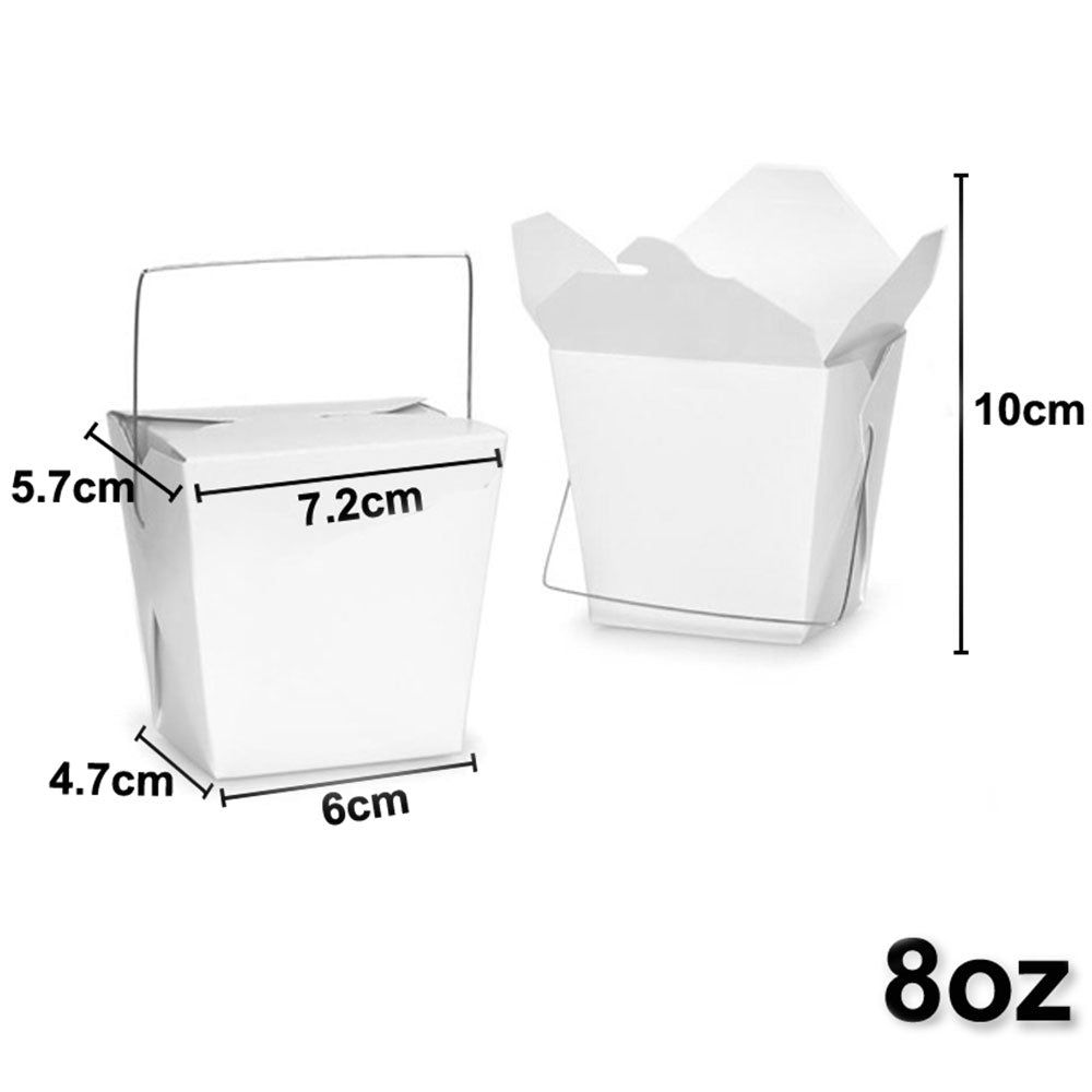 Finished in white cardboard with metal handle. Perfect for party favours, finger food at cocktail parties. Or serving Asian food. These White noodle boxes with metal handles are in a handy pack of 200 and have a multitude of uses. !