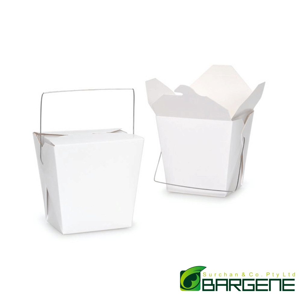 Finished in white carboard with metal handle. Perfect for party favours, finger food at cocktail parties. Or serving of asian food. These 26oz /780ml (Approximate Measurements - Height - 105mm Top - 100mm x 90mm Base - 80mm x 65mm) White noodle boxes with metal handles are in a handy pack of 100 and have a multitude of uses.