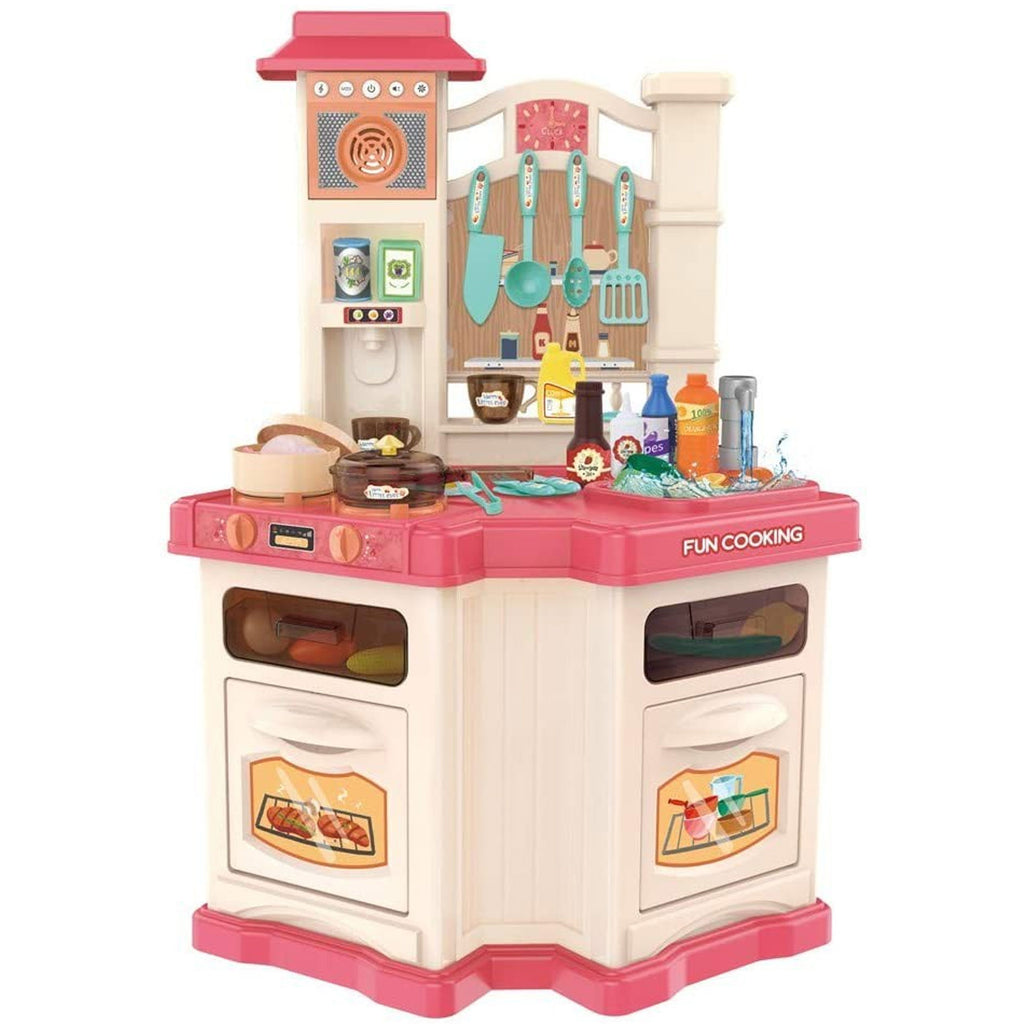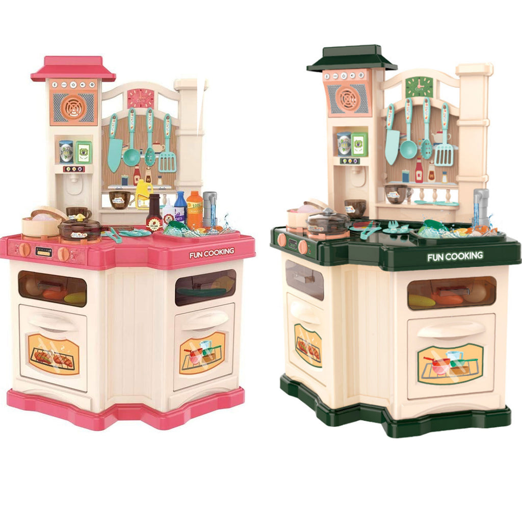 Our kitchen set comes with multiple simulation kitchenware and modern appliances, such as a real-like water outlet, non-hot false steam with lights and sounds, colourful fruits and veggies, music, stories, fan, and volume control, and kitchen faucet with running water for a real-like cooking experience. It also comes with storage shelves and cabinets for neat and tidy kitchenware organisation and a real-like dessert stand with false sweet treats and decorative trays.