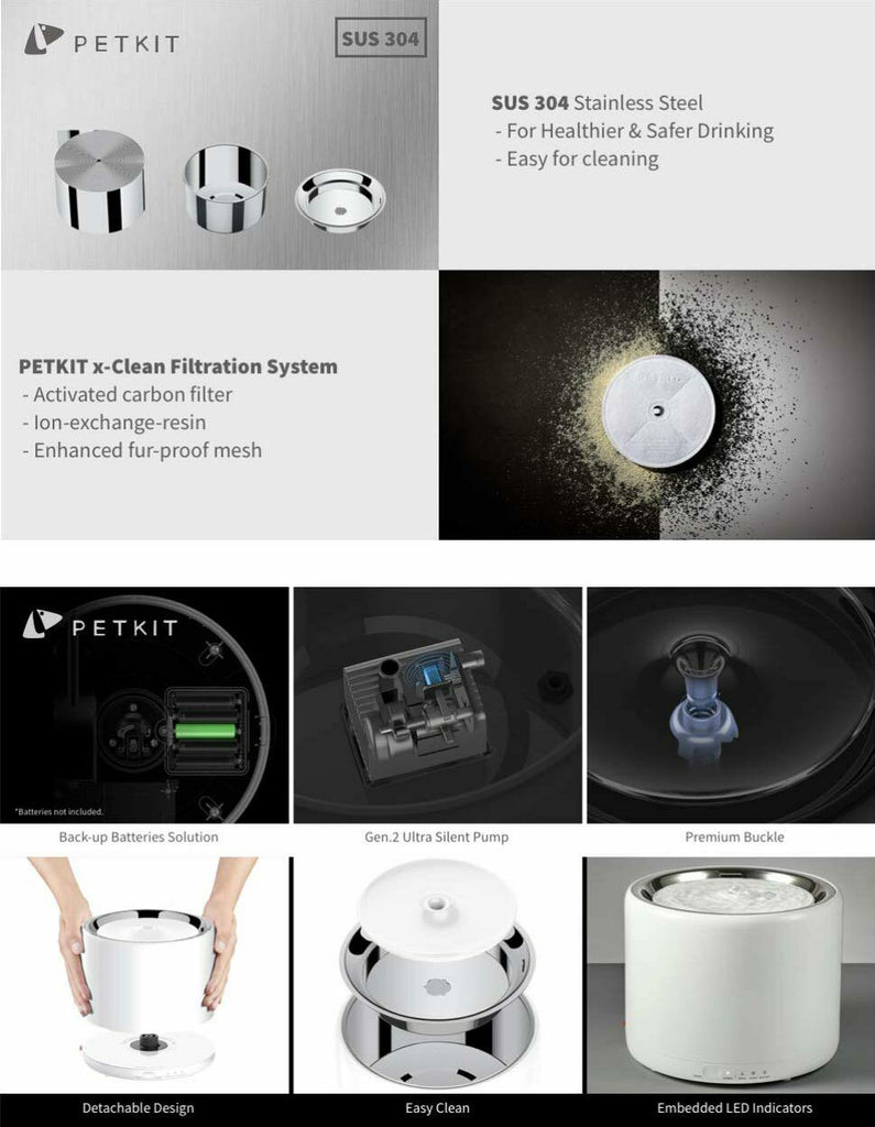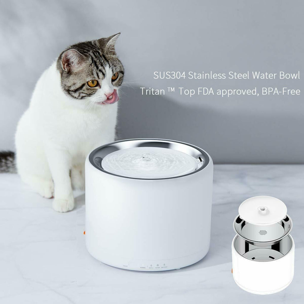 xQuality - 1.35L/46oz capacity of this pet fountain for cats and dogs made with 304 stainless steel water bowl and tray, Tritan water top which is FDA approved and BPA FREE. It will provide long-lasting strength as well as a safe drinking experience for years to come. The special design encourages your pet to drink more.