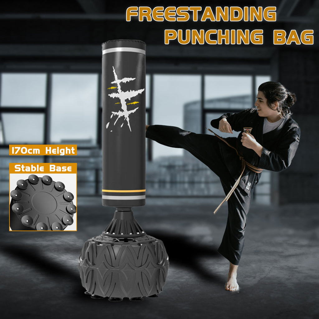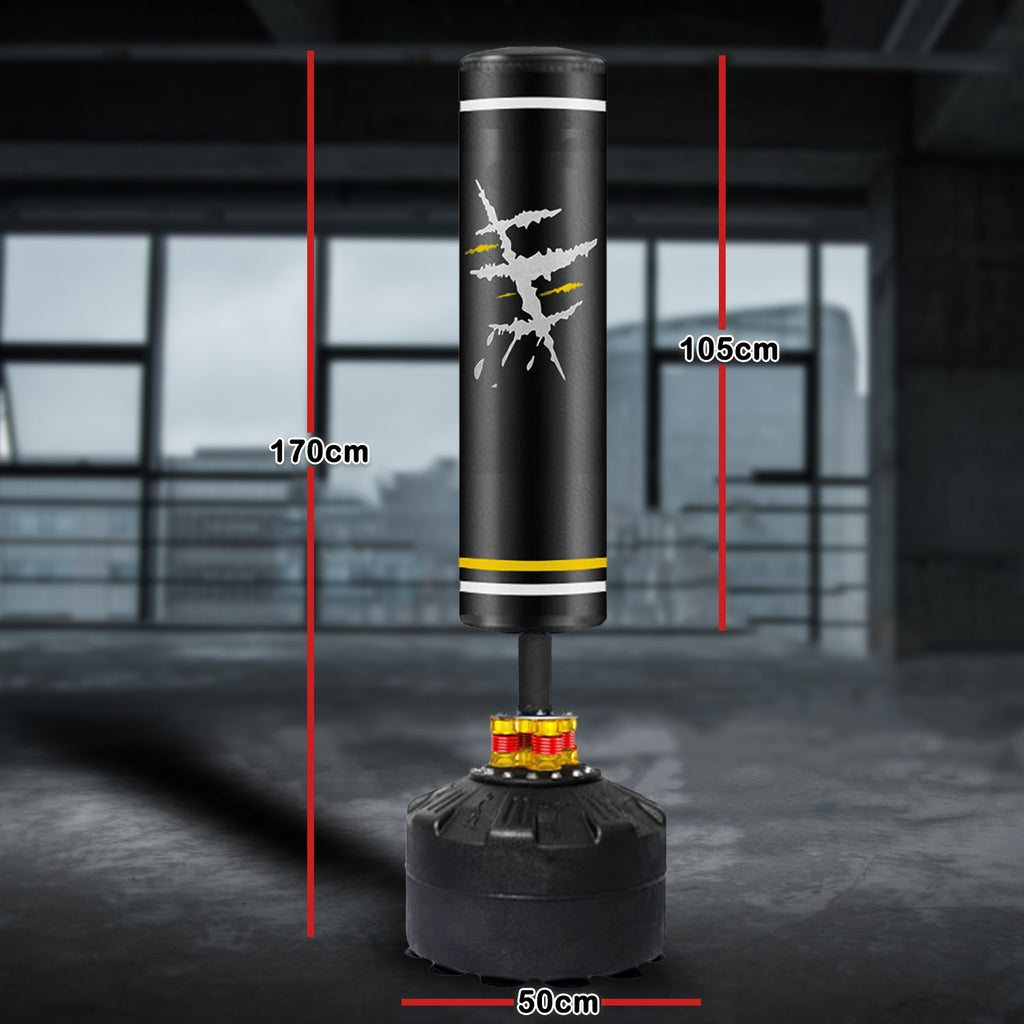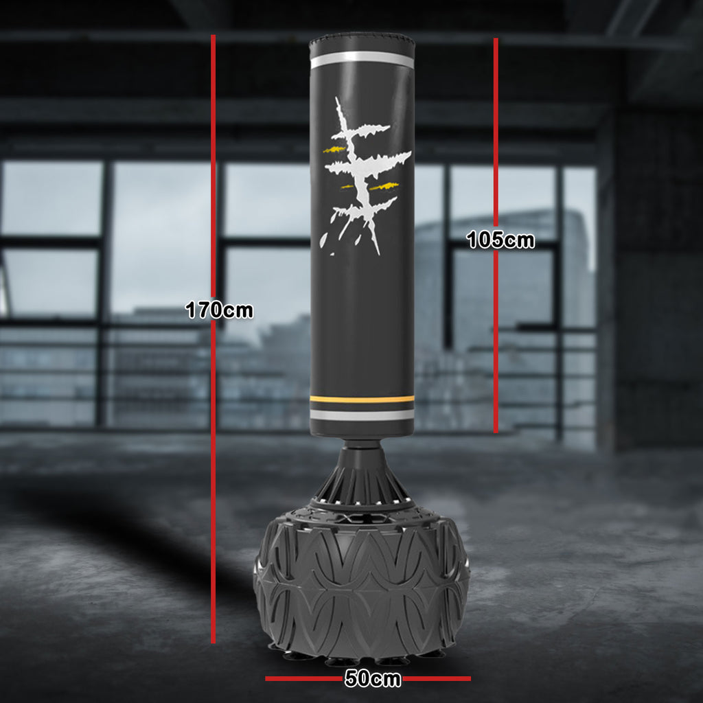 Boxing and other martial arts are booming in popularity as people discover their benefits. No longer just for self-defence, these sports increase agility and cardiovascular fitness, making them perfect for cross-training and general fitness. Now, you can train at home as well as in the gym with this free-standing punching bag. Standing at 170 centimetres, the bag simulates an opponent of about average height to make your workout as real as it gets – without the counterpunch. With high-resilience hydraulic foam padding and elastic fabric, it springs right back with each punch, protecting your hands from injury. The PU leather gives it added durability for long wear, even under heavy use. A tethered loop on the base reduces the swing, giving you more control.
