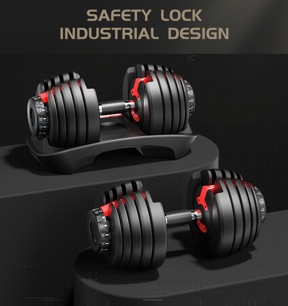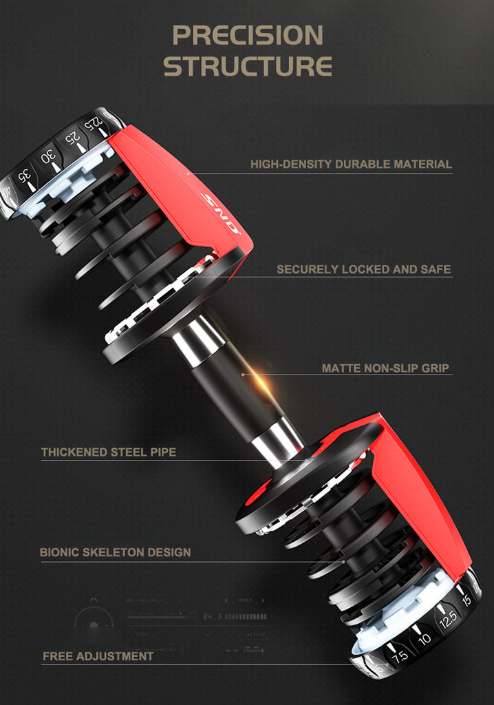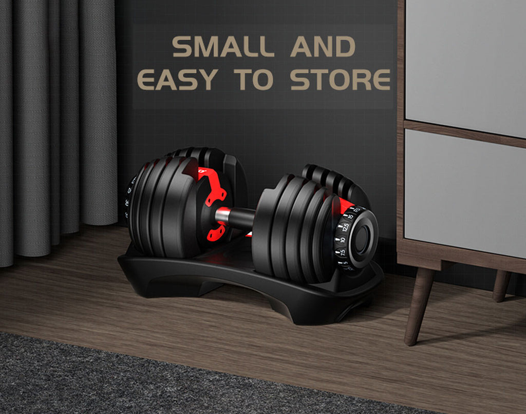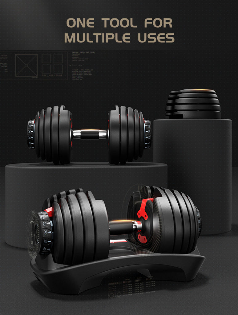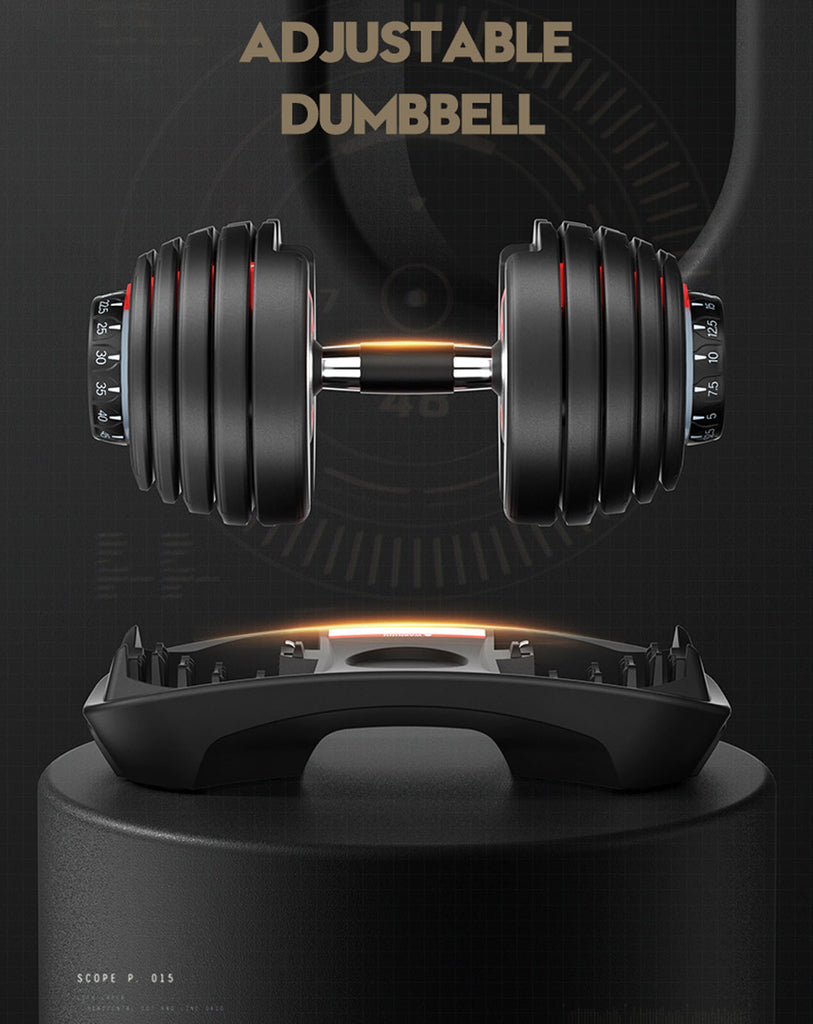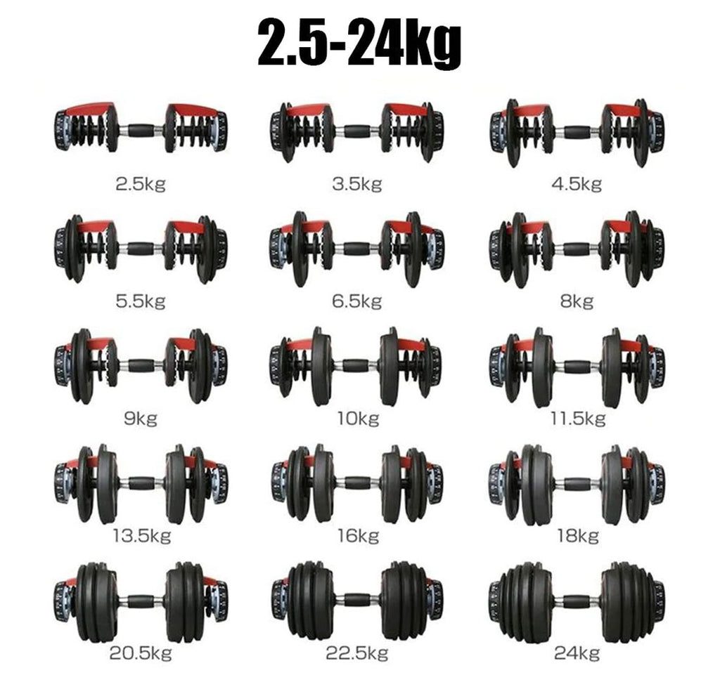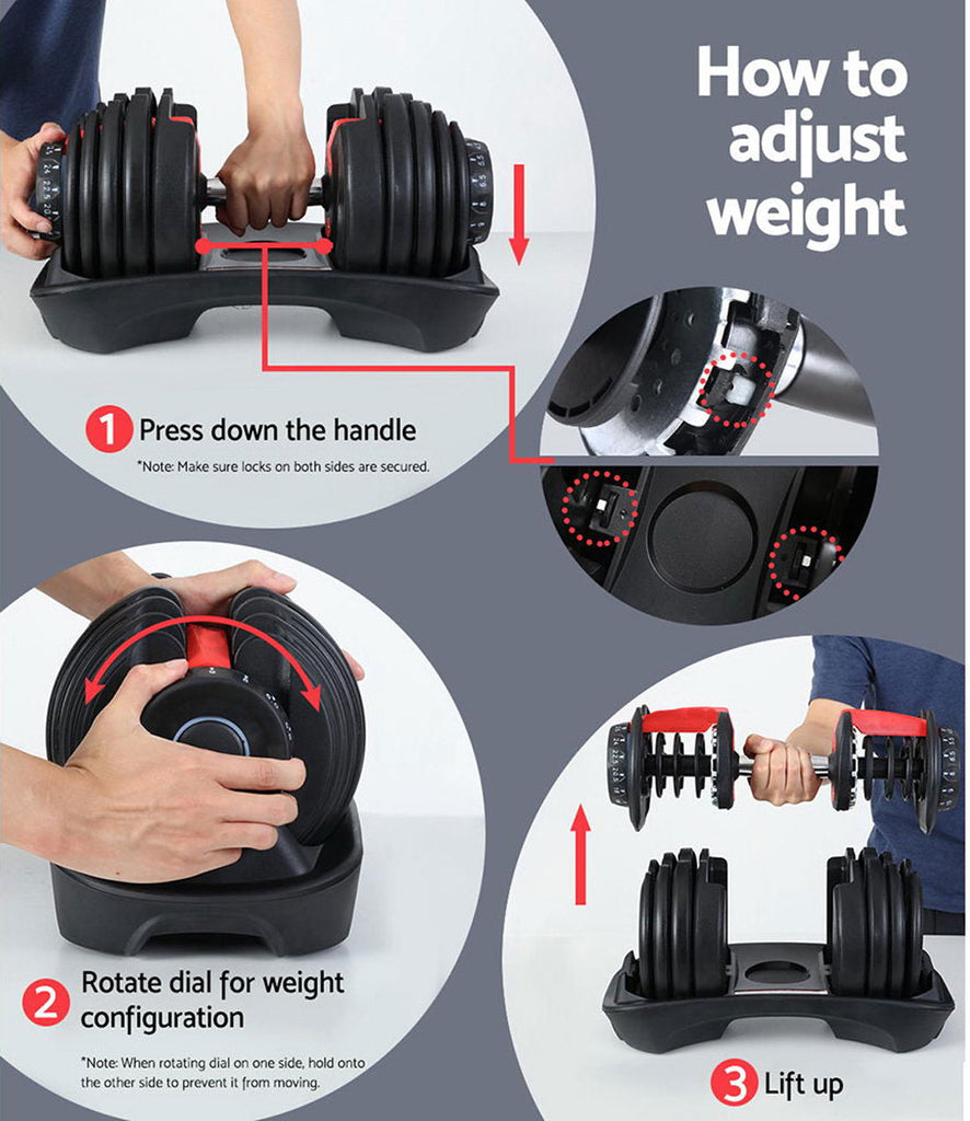 Time to get tough. If you are looking to boost those triceps, biceps and shoulders, our Adjustable Dumbbell is the perfect deal for you. Whatever your game is, our dumbbell set lets you strengthen and tone those muscles your way. This commercial-grade set features a high-quality bar with non-slip handle that offers optimal gripping surface. The innovative design allows for 15 combinations of quality incremental weights from 2.5kg to 24kg, to suit your workout requirements. The 10 plastic-coated iron weight plates sit in the dumbbell holder. You can just press down the high-quality steel dumbbell bar onto the weight plates and rotate the weight adjustment dial for the right plates to lock into place. The high-quality star-shaped nuts ensure the weight plates stay securely in place for safe workouts. Gym junkie or workout pro, you can get fit easily with our Adjustable Dumbbell.
