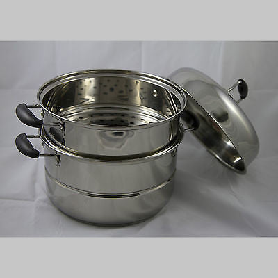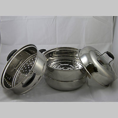 This is a high quality 3 tiers steamer. This stainless steel steamer is dishwasher safe and very easy to clean. With 0.5mm body thickness, it is suitable for gas, induction hub, and electric hobs. It includes the built-in glass lid to see through the cooking and get the best result of your steamer. Each tray can be used as separate pots, they can be set as 1,2 or 3 tiers steamer. This steamer will ensure the safety of your family with heat resistance handle.