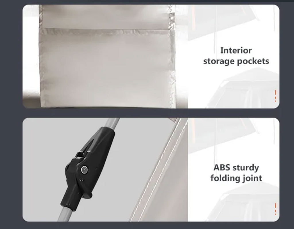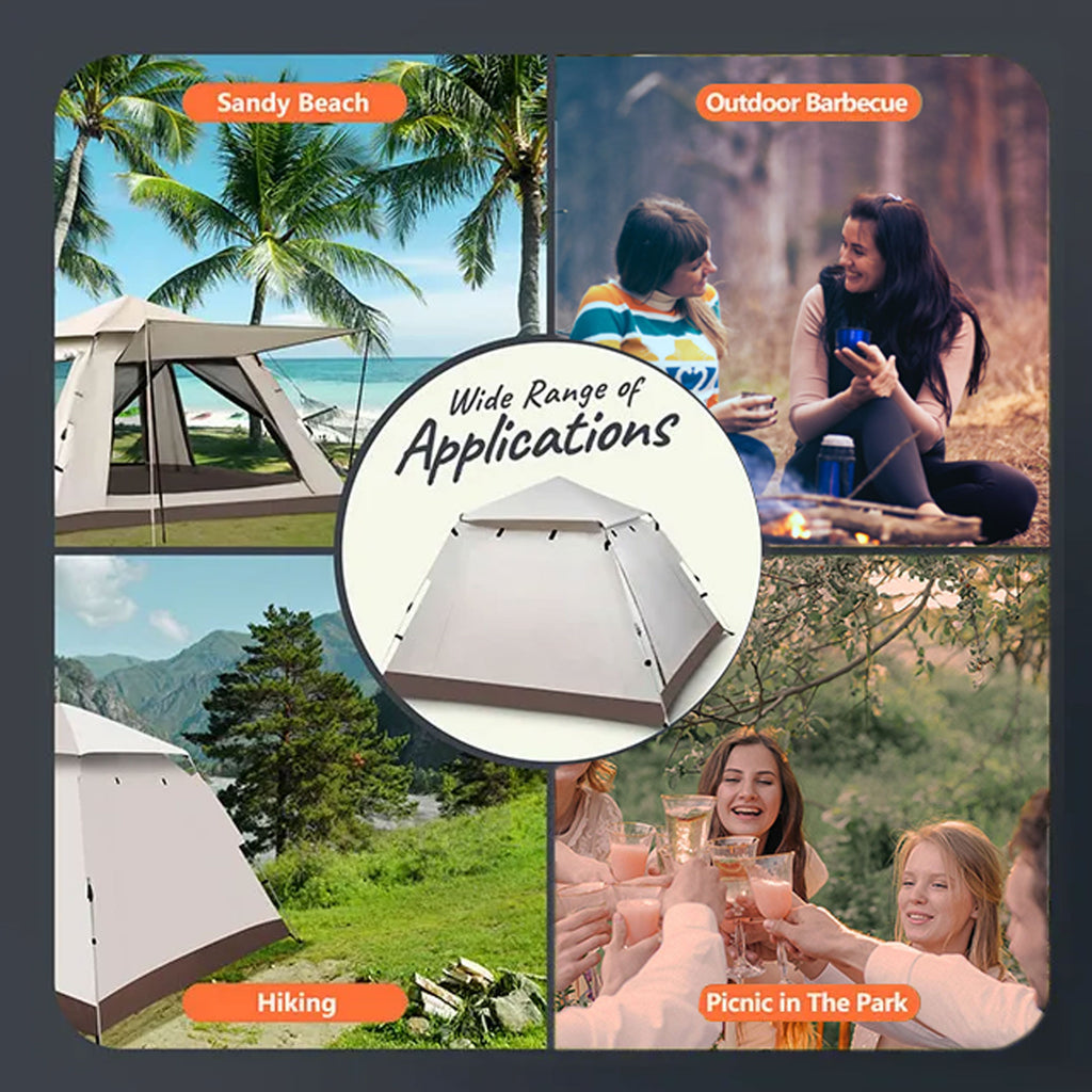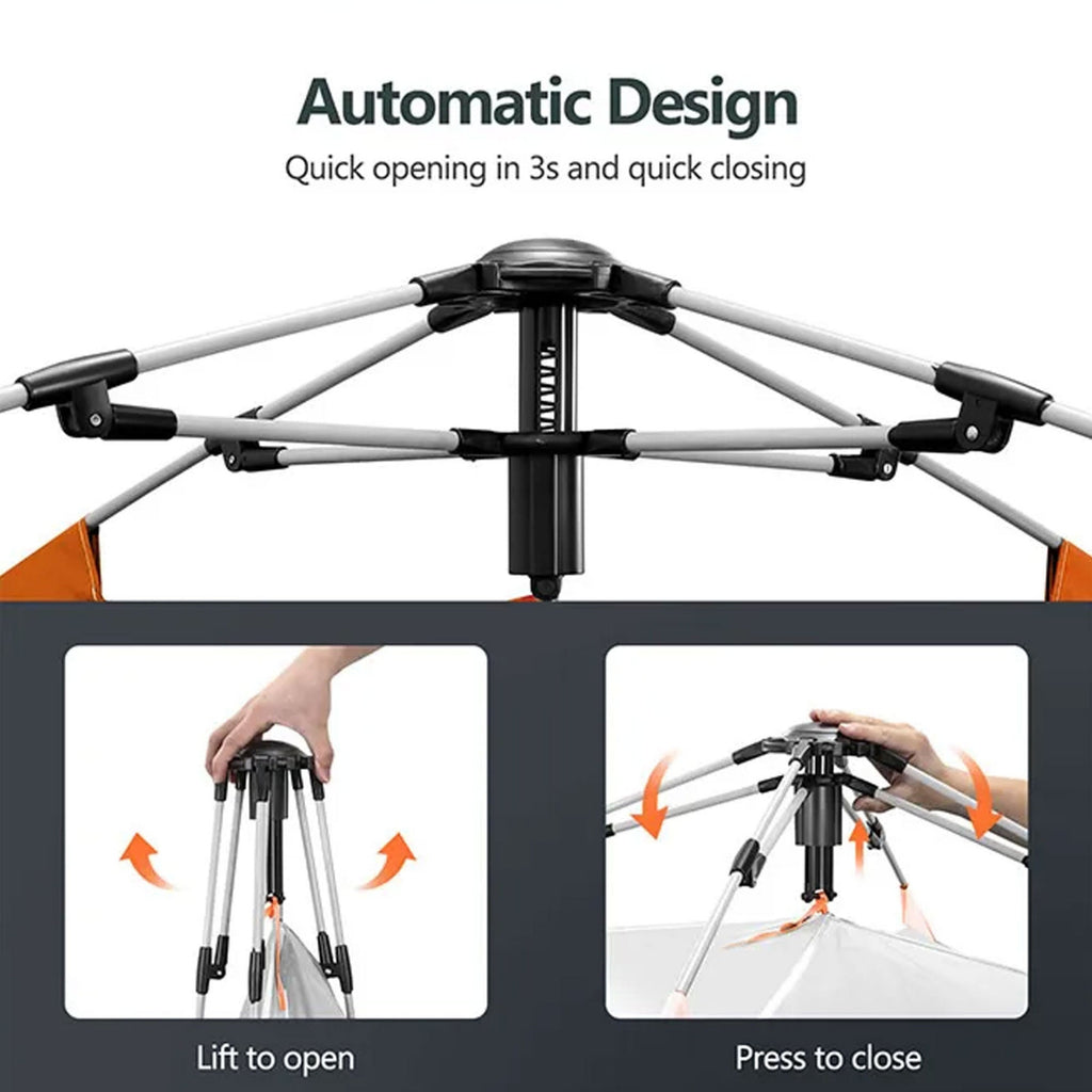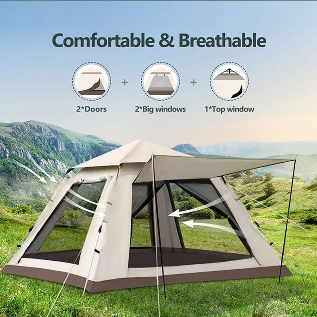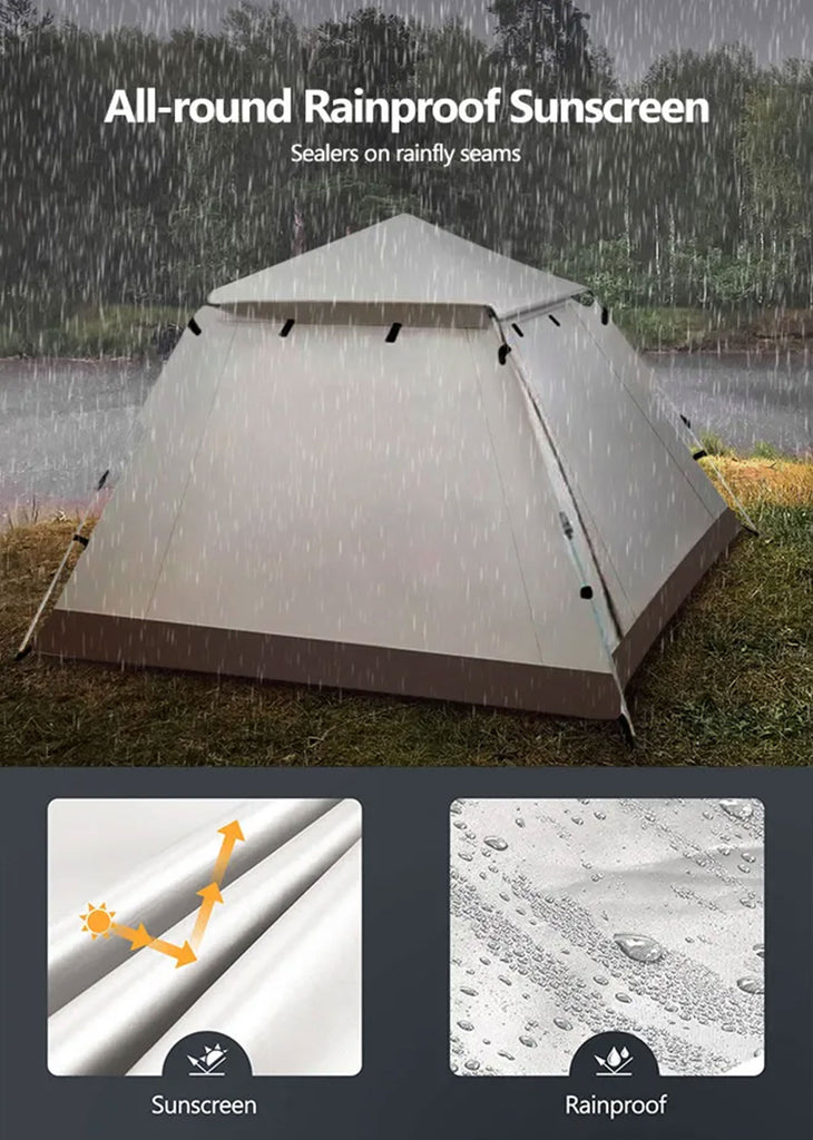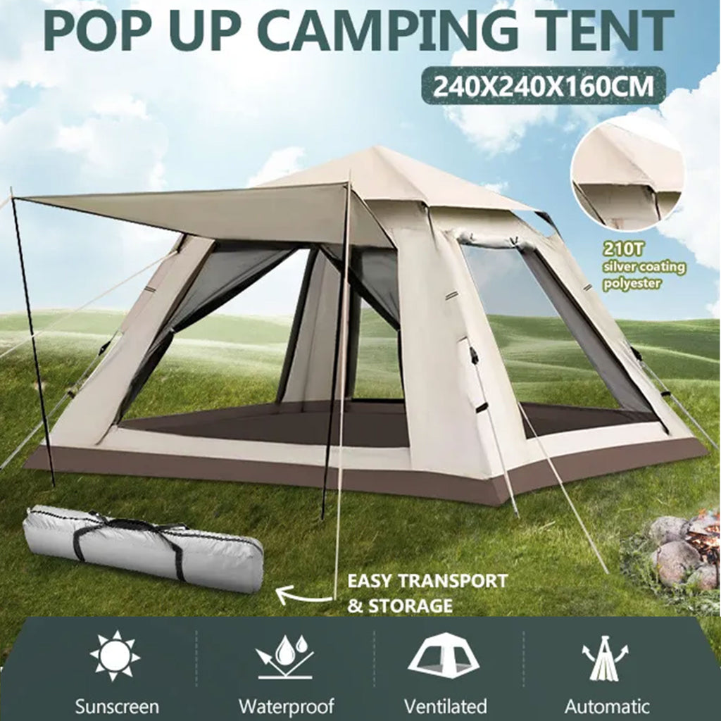 Perfect for any outdoor camping trip, this instant pop-up tent is the ultimate accompaniment to tackle exciting adventures and experiences. Its ultra-high-quality silver coating on polyester and oxford cloth makes them waterproof to 3000 mm and provides strong UV protection. To maximise protection against inclement weather, the rainfly and inner tent seams are securely PU-taped. Double entry doors incorporate two large windows and a top screened window, ensuring unexceptional comfort, ventilation, airflow, and extra privacy. An overall size of 240cmx240cmx160cm offers room for up to four campers. The superb fast-pitch design, paired with an easy pack-down solution and lightweight yet strong materials, enables you to spend more time relaxing and enjoying your family or solo holiday.