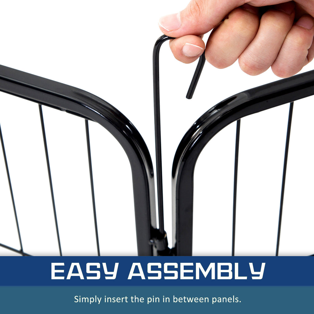 It is a multi-configuration playpen with 8 panels which allows you to turn your playpen into different shapes. The playpen is made of durable extra heavy duty steel frames construction with black powder coat finish. This fine finish provides long lasting protection and weather resistance. The access door has bolt latches and this ensures that your pet doesn’t have the opportunity to run away and the round edges ensure pet safety.
