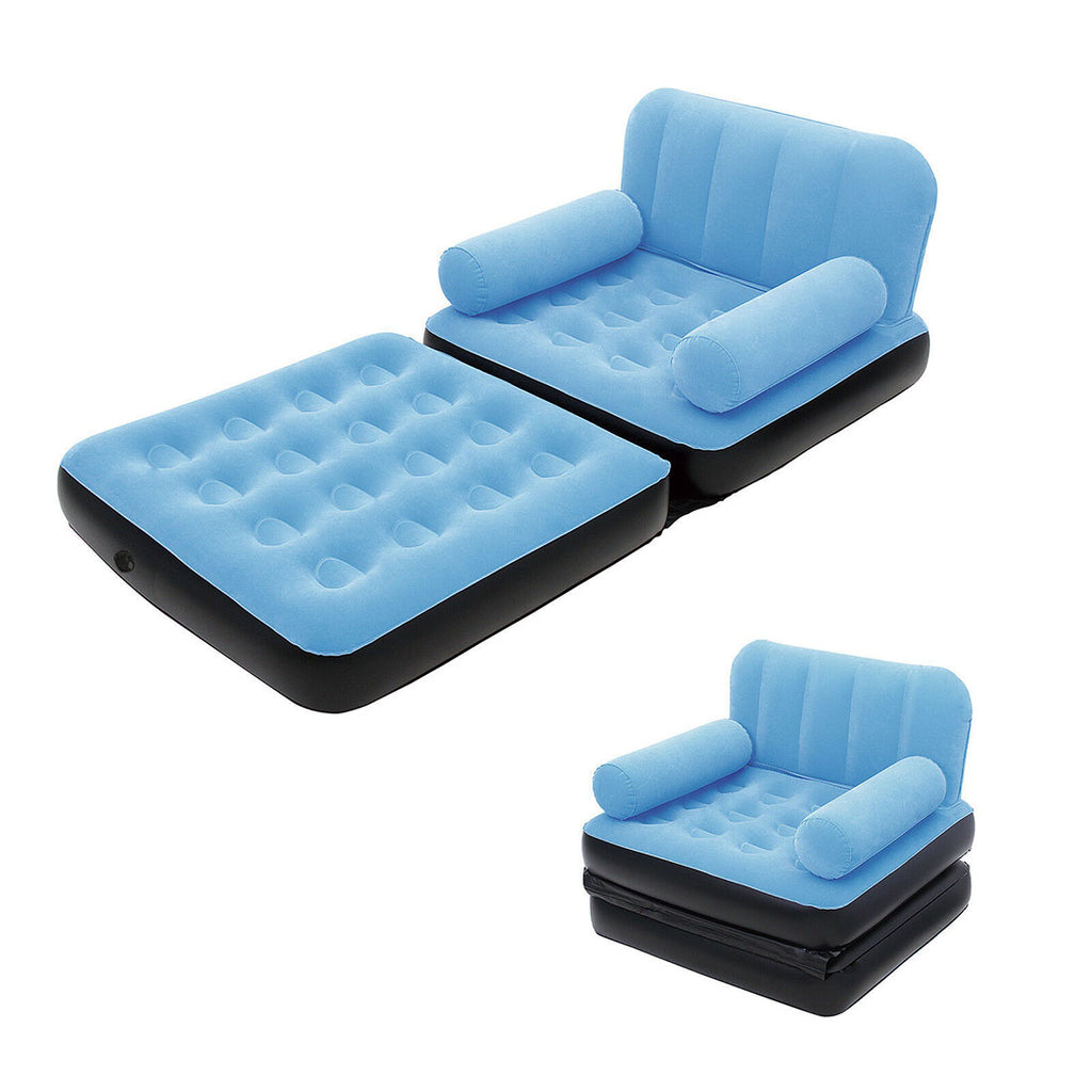 This inflatable 2 in 1 multi-functional couch is ideal for sitting and sleeping when you have any beloved unexpected visitors. It can be inflated quickly, save your time when you need it. It can be transformed from a sofa to a recliner and to a lounger. It is a single-sized bed and has a flocked sleeping surface. It is made from vinyl and crafted with a sturdy coil beam construction you or your guest is sure to have a restful night's sleep.