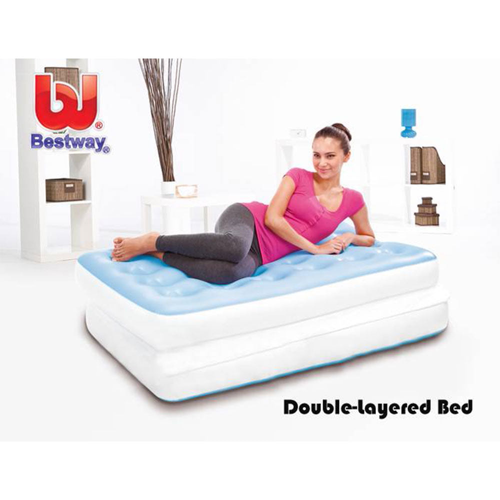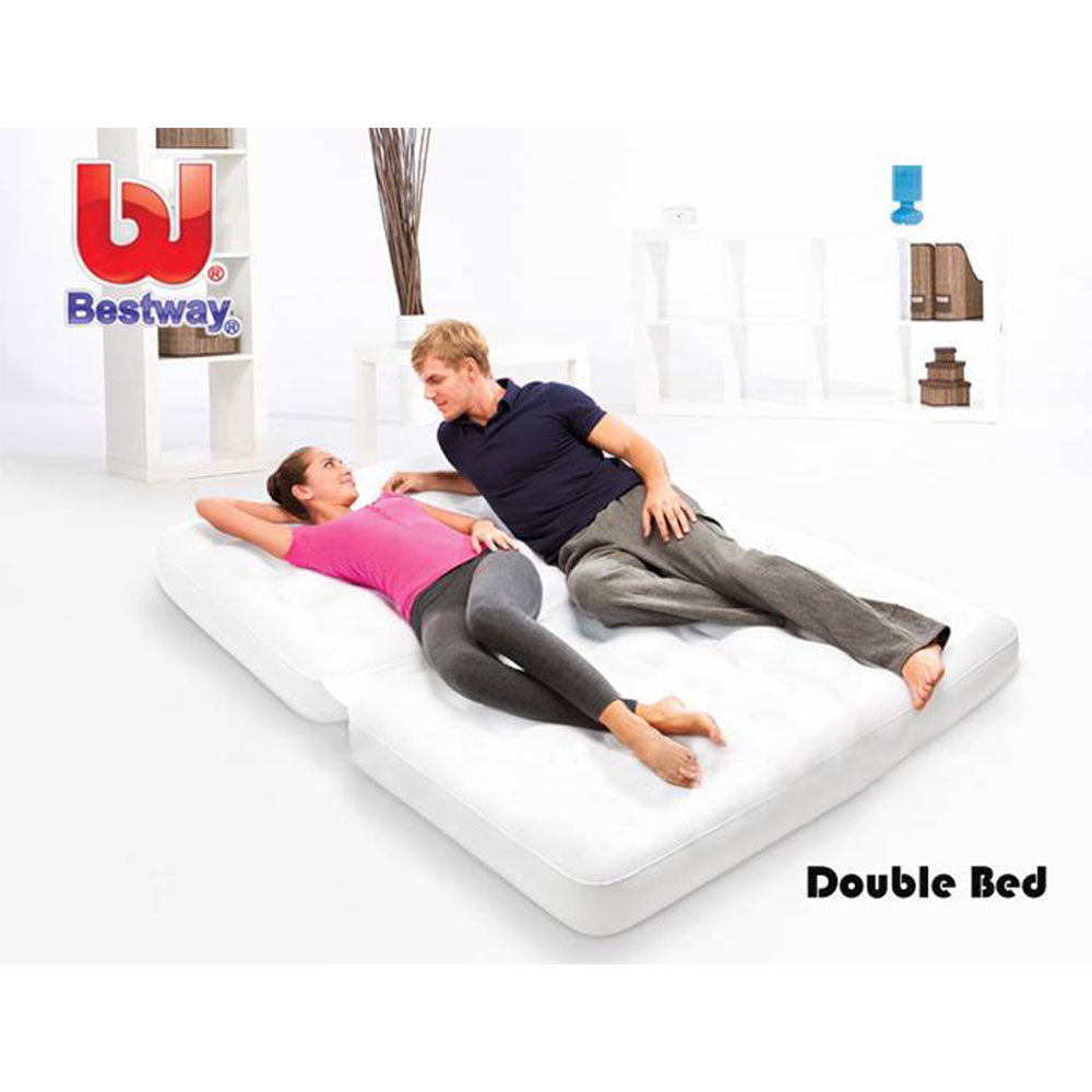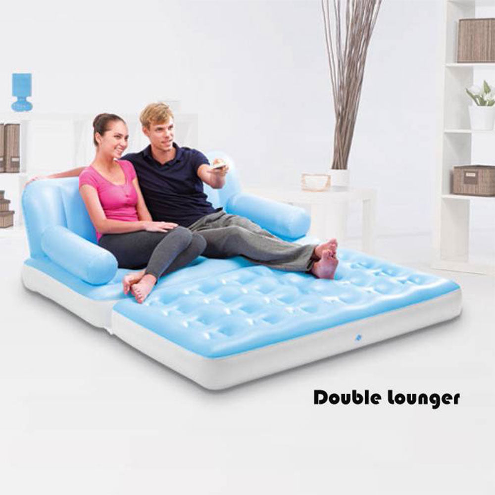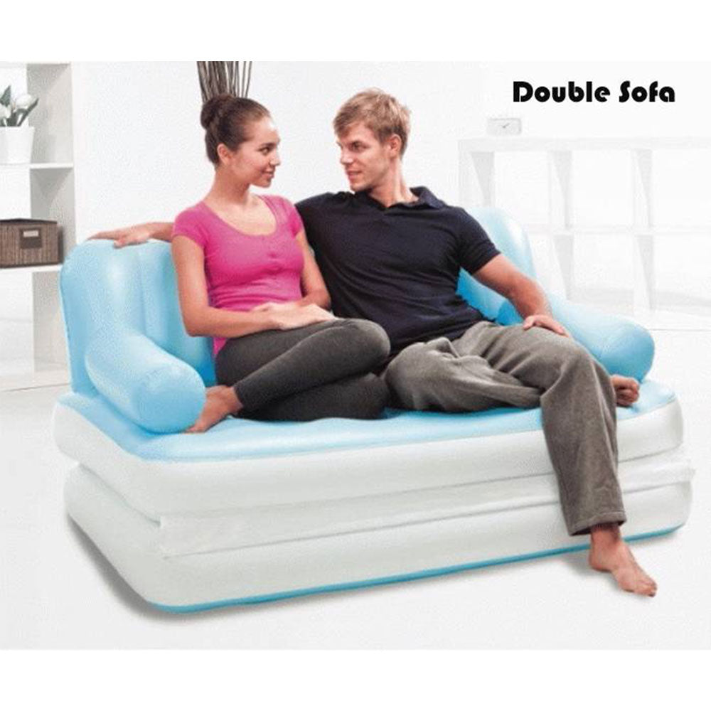 This flocked inflatable couch is a versatile addition to any room. Converts easily into a double bed, recliner, lounge or raised bed in minutes using the included AC air pump. This size works for two people, with plenty of arm and back support. Great for hosting guests or when you need additional seating. Compact and easy to store in the included travel bag. Perfect for apartments, dorm rooms or temporary guest rooms. Not only does it look great, but its coil beam construction and flocked surface provide a very cozy, comfortable seat.