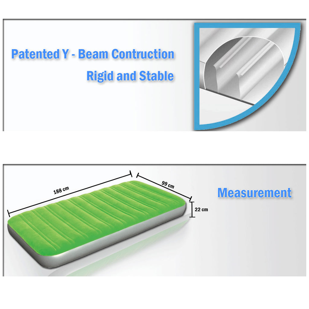 Bestway Easy Inflate Flocked Air Bed Single size Designed for comfort and convenience, sleeping under the stars is relaxing with Bestway Easy Inflate Single Sized Air Bed. Nobody enjoys the achy restless feeling waking up after a night camping with your friends and family. The flocked fleece lining provides you with a new level of comfort that will make look forward to those camping nights.