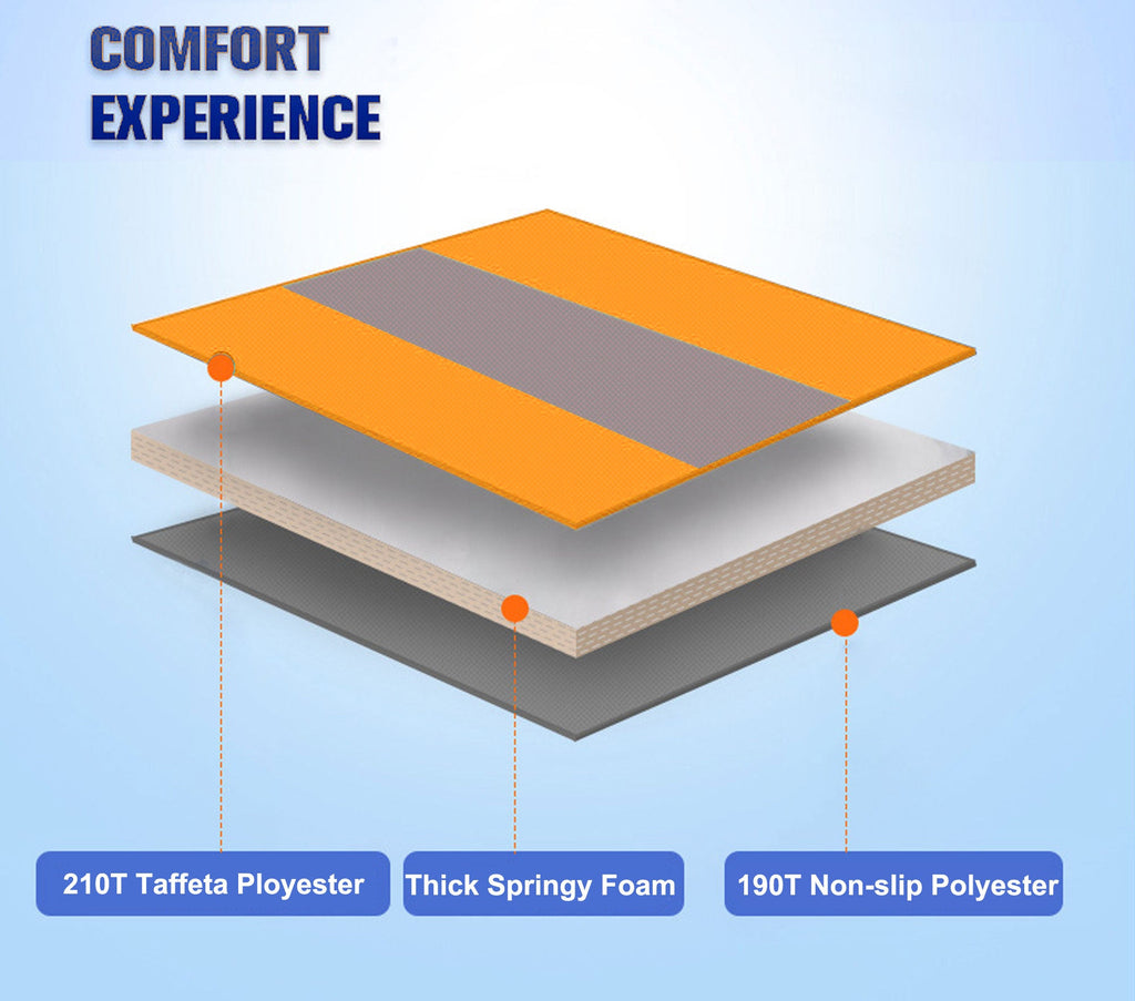 As the name says it all, the water-resistant Mat self-inflates through built-in valves in just 60 seconds, presenting you with a smooth sleeping surface amidst all types of terrain almost instantly. Made from high density polyurethane foam, the Mat is wrapped with a smooth surface top and anti-slip polyester pongee bottom. That way, you lie on a smooth and comfortable surface with a mat that does not slip or move with your every turn while sleeping or shifting around.