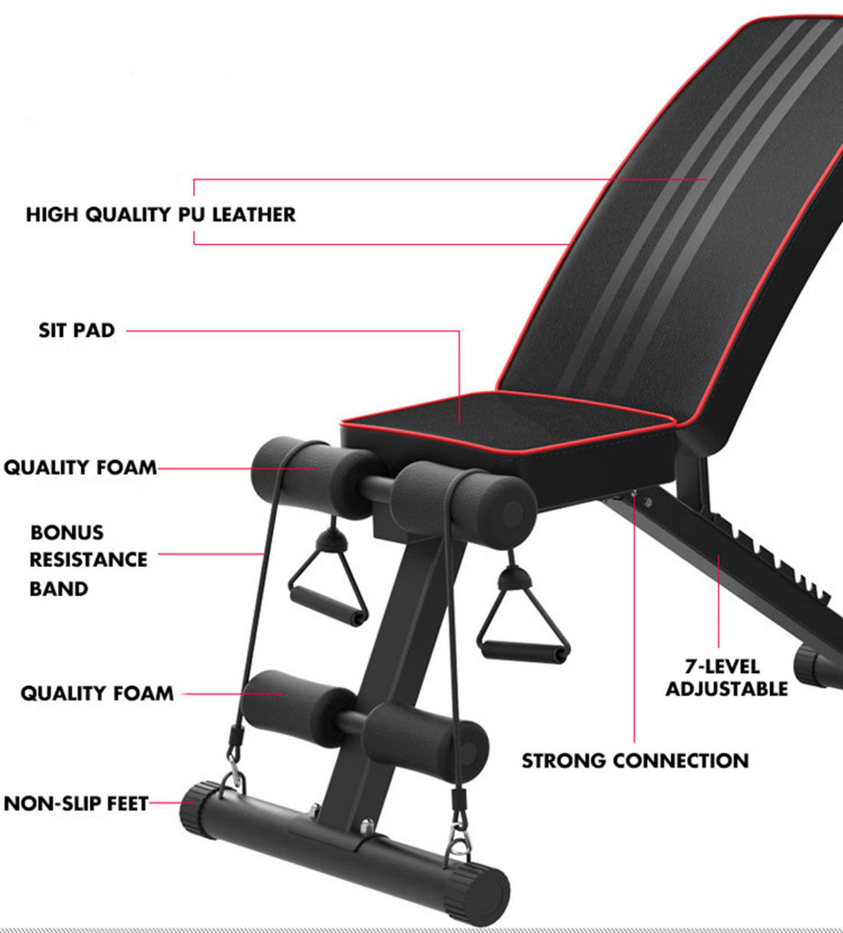 Our FID Bench is the ultimate fitness equipment to complete your home fitness workout. Featuring a fully adjustable joint, the backrest is adjustable to seven positions. It can operate flat, inclined or declined, delivering maximum versatility for your home workout. From military presses and bench presses to bent-over rows, this bench can do it all. While it is extra effective, the comfortable leg rest keep your feet and legs locked into the correct position for maximised comfort. Featuring durable powder-coated steel tube construction, waterproof and oil-resistant PU leather and non-slip feet, the FID bench can easily withstand even high-intensity exercises. It also comes with bonus resistance bands to add variety to your workout. So save the trip to the gym and get fit at home with our FID bench.