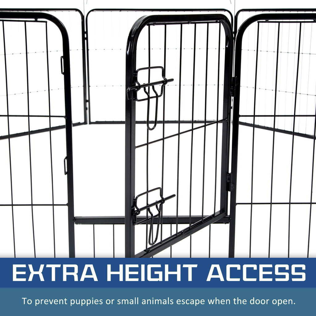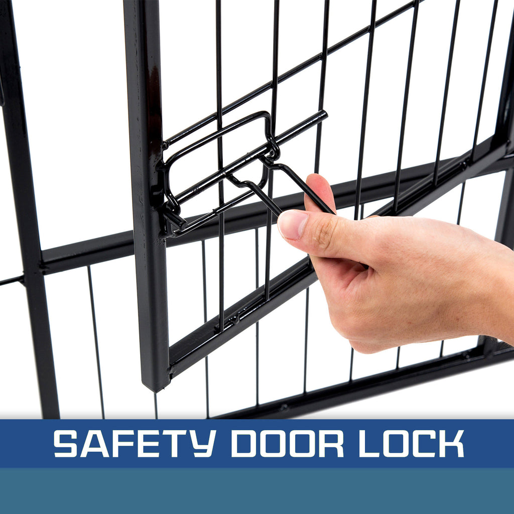 It is a multi-configuration playpen with 8 panels which allows you to turn your playpen into different shapes. The playpen is made of durable extra heavy duty steel frames construction with black powder coat finish. This fine finish provides long lasting protection and weather resistance. The access door has bolt latches and this ensures that your pet doesn’t have the opportunity to run away and the round edges ensure pet safety.