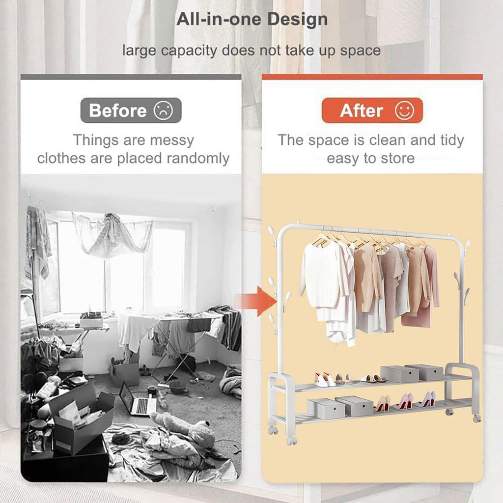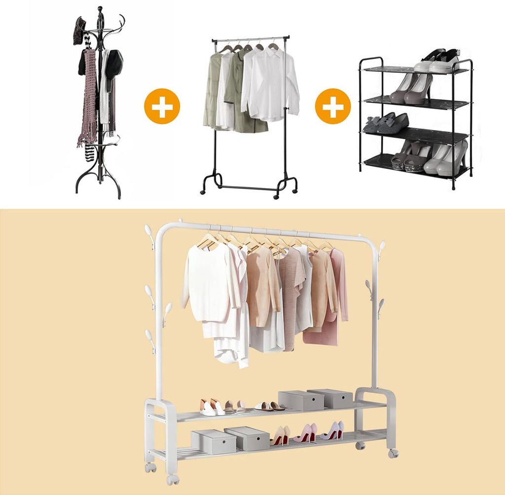 • The hanging rods to meet daily needs. Bottom shelf gives the clothing rack added strength and stability, also provides off-the-floor space for shoes, boots, baskets and bags, umbrellas