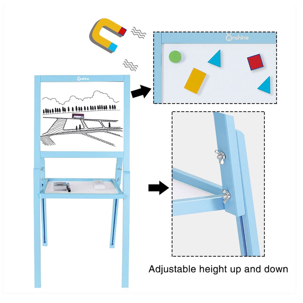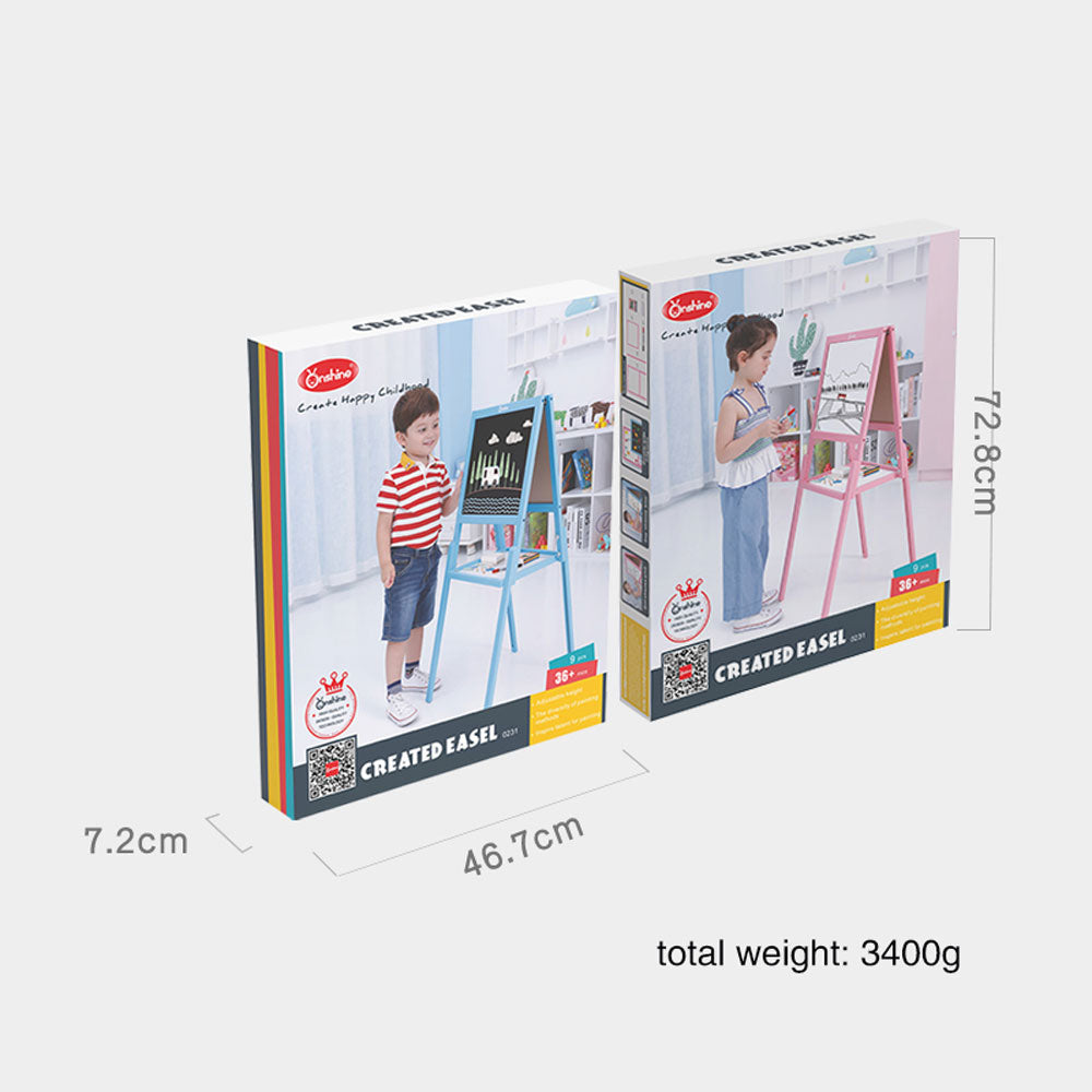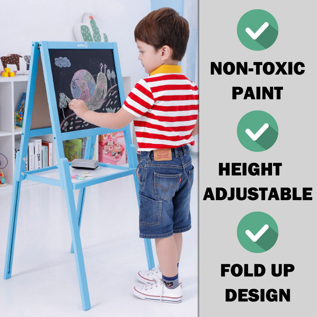 Encourage your child to learn through play with equipment that they love to use. This easel represents the state-of-the-art upgrade from best design and quality improvements in a modern presentation. Created to provide toddlers to primary school children an excellent platform for artistic development, fine motor skill development, writing skills development and general enjoyment with lots of fun, by way of painting, drawing, learning to write, and storytelling and more, everyone will see the benefits. It incorporates a whiteboard with paper clip and a chalkboard.