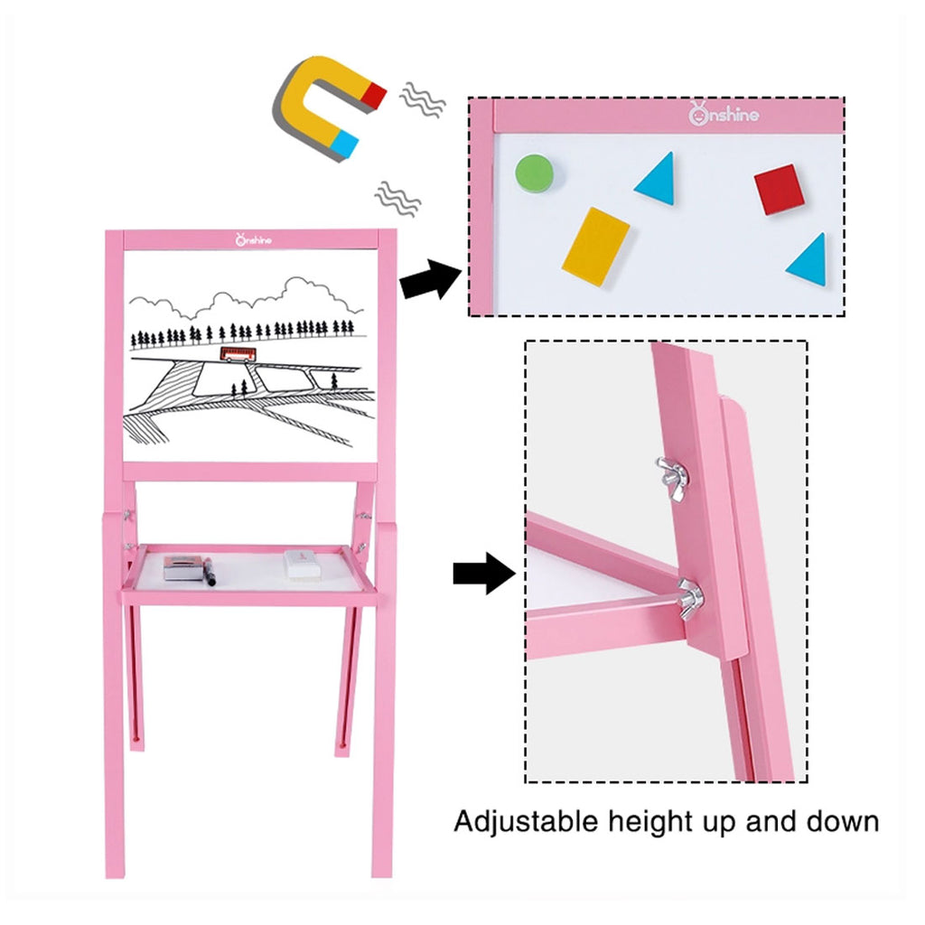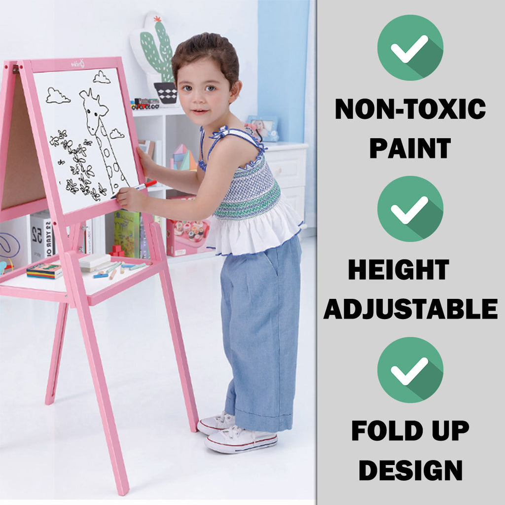 Encourage your child to learn through play with equipment that they love to use. This easel represents the state-of-the-art upgrade from best design and quality improvements in a modern presentation. Created to provide toddlers to primary school children an excellent platform for artistic development, fine motor skill development, writing skills development and general enjoyment with lots of fun, by way of painting, drawing, learning to write, and storytelling and more, everyone will see the benefits. It incorporates a whiteboard with paper clip and a chalkboard.