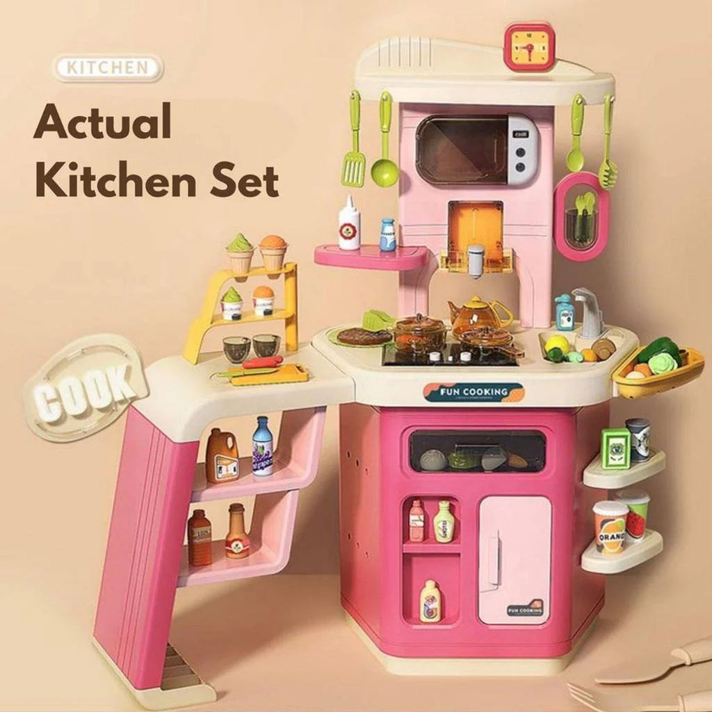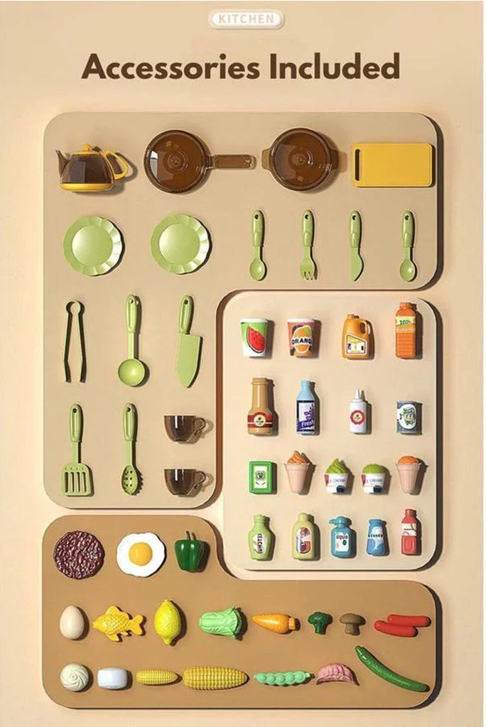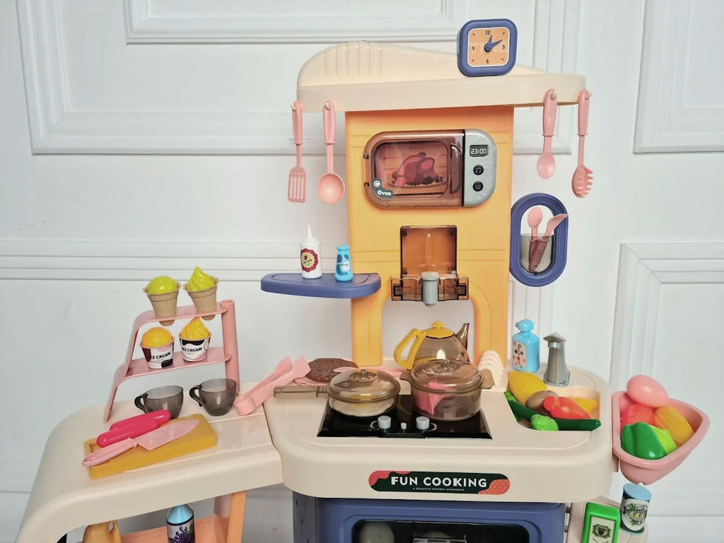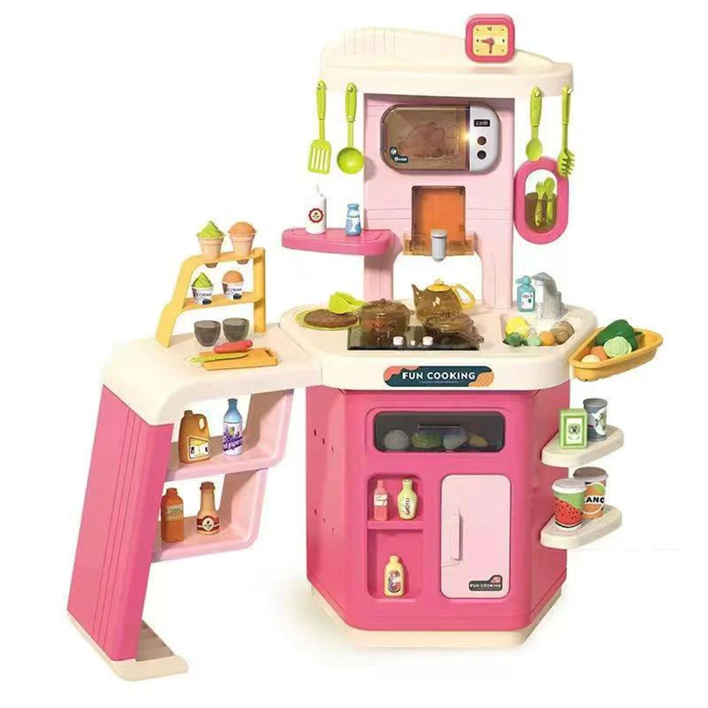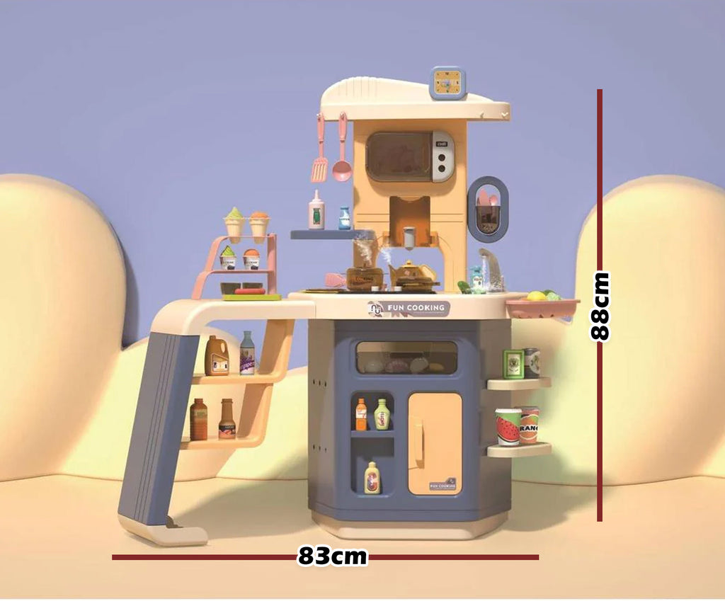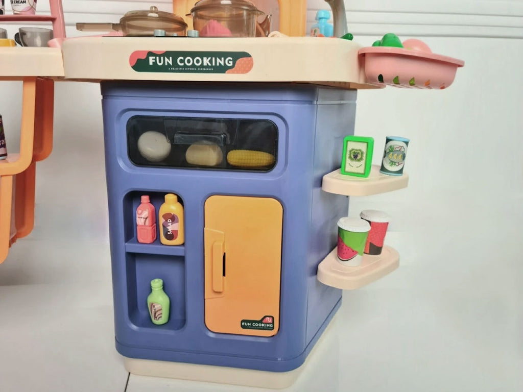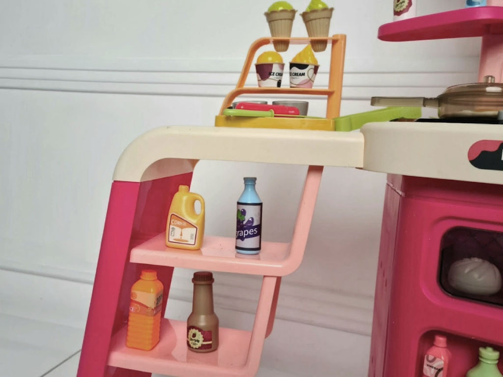 Our kitchen set comes with multiple simulation kitchenware and modern appliances, such as a real-like water outlet, non-hot false steam with lights and sounds, colourful fruits and veggies, music, stories, fan, and volume control, and kitchen faucet with running water for a real-like cooking experience. It also comes with storage shelves and cabinets for neat and tidy kitchenware organisation and a real-like dessert stand with false sweet treats and decorative trays.