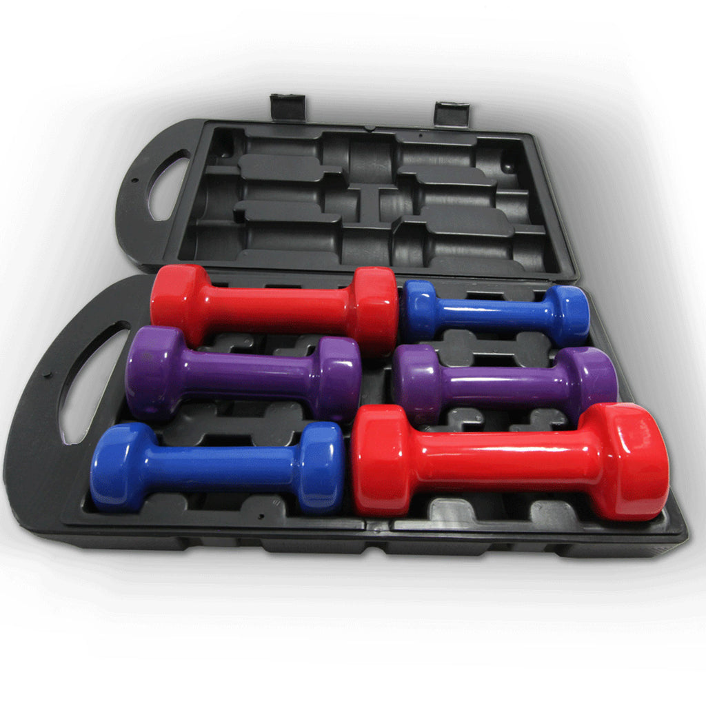 Looking for an easy way to develop your muscle tone? Then look no further than this colourful and compact dumbbell set. There are three weights to chose from – 2.5kg, 1.5kg and 1kg – so you can select the right weight for your body shape. Develop strong bone density and muscle tone with gentle or vigorous weight lifting all in the comfort of your own home. These dumbbells are built to last from quality iron and covered in a non-slip vinyl for the ultimate grip. And when the work out is over, simply slip the dumbbells back into the case and stow away for your next home gym workout!