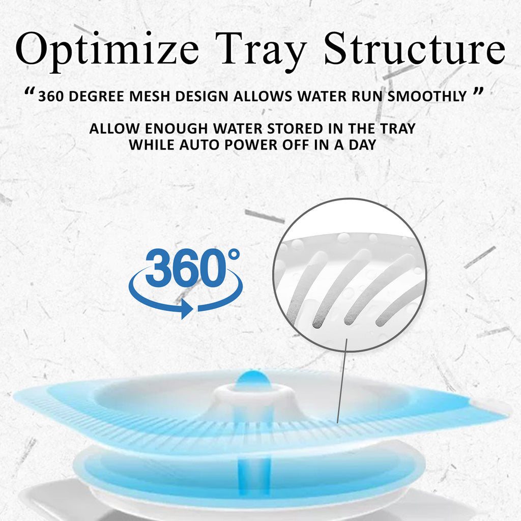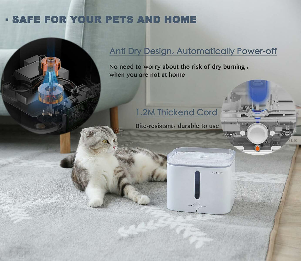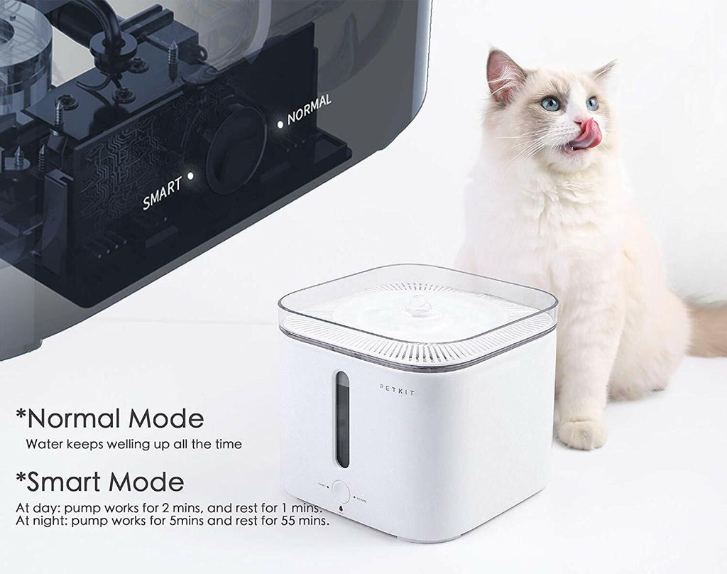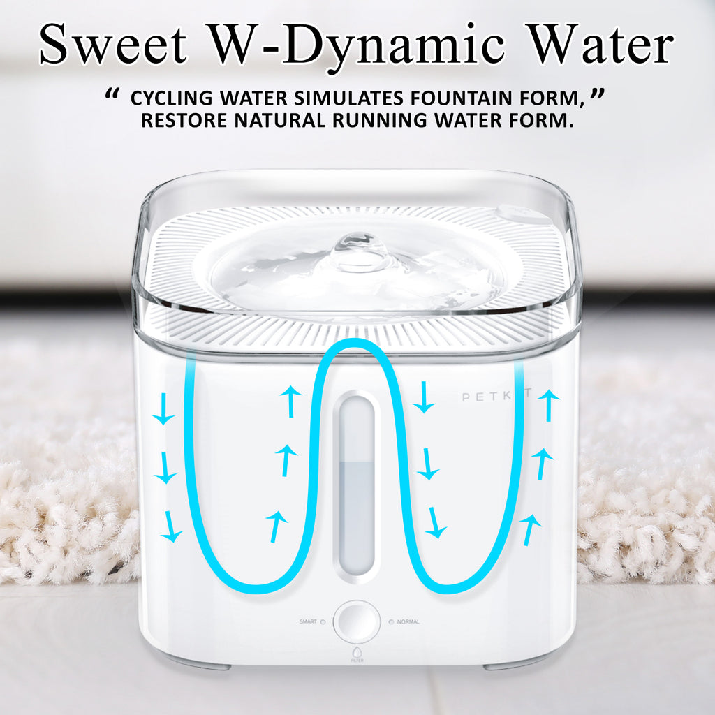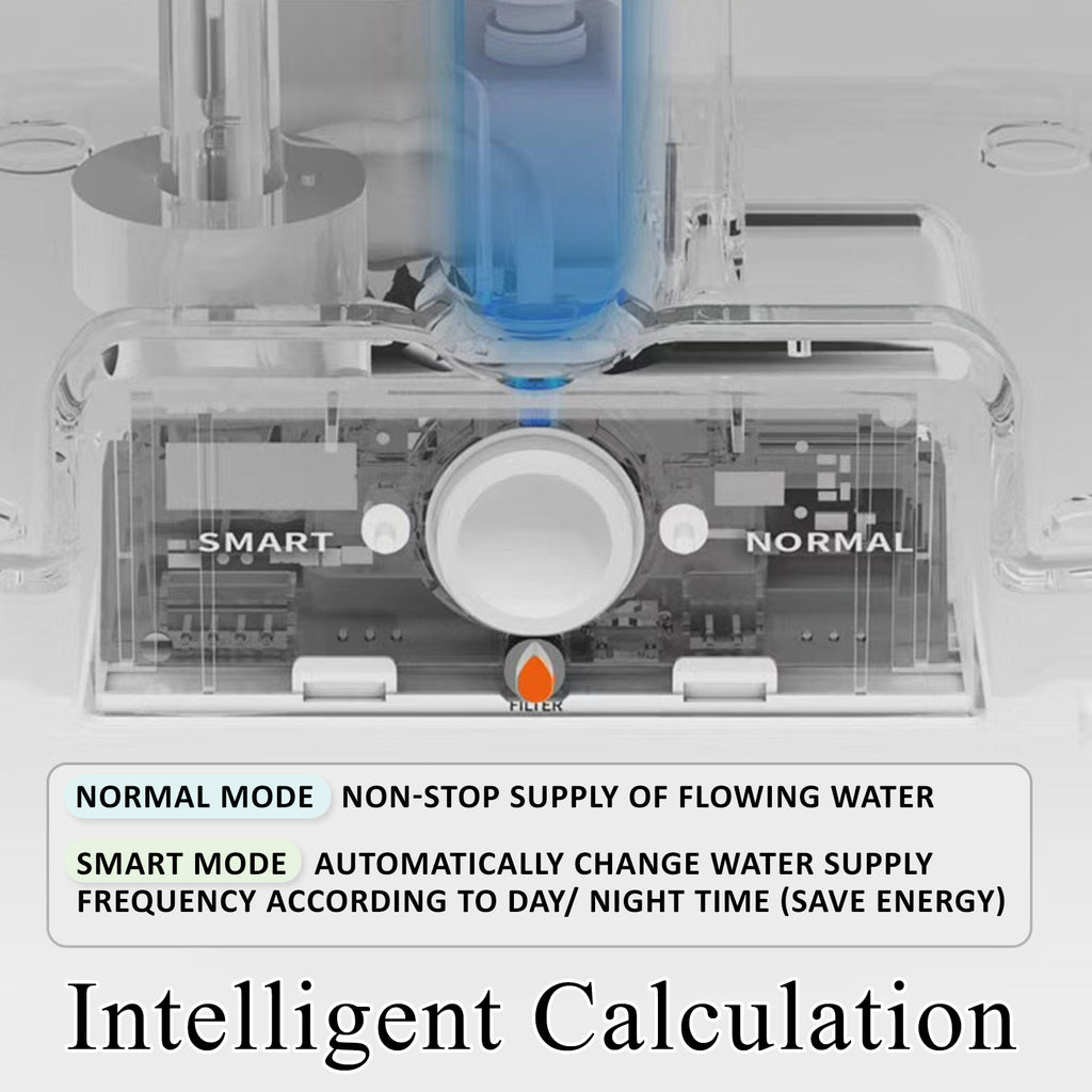 Dual modes to meet your needs at any time. Equipped with light sensor and water volumetric indicator when the fountain is working at the SMART mode which is quieter and energy-saving, it can automatically change the water welling up frequency between day and night. When at the NORMAL mode, the water would keep welling up to make sure that your pets can always get access to the freshwater, especially after their intensive activity back to home the outside. Unique water flow design with circulation filtration to deliver fresh water always.