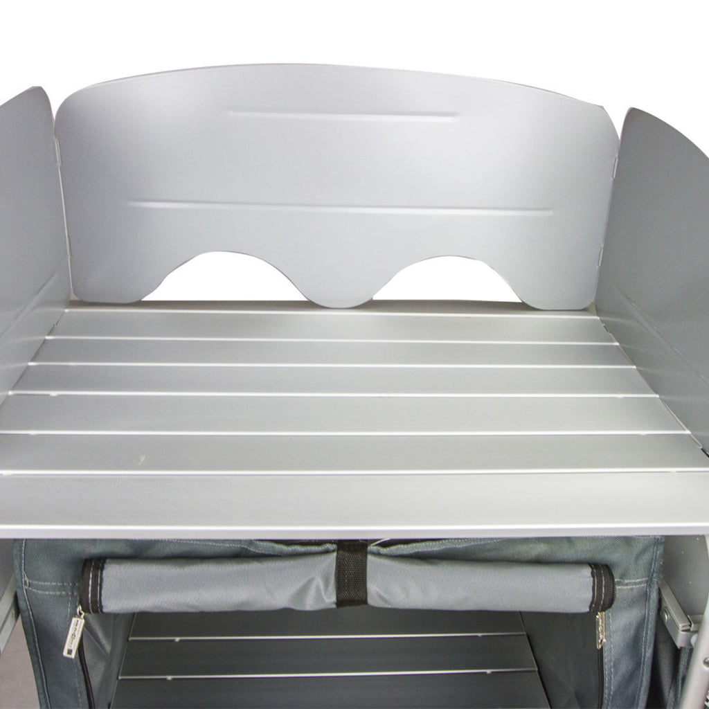 The top shelf is the perfect size for a hotplate or washing up tub, with a steel windshield to protect your sausages and steaks from the weather.