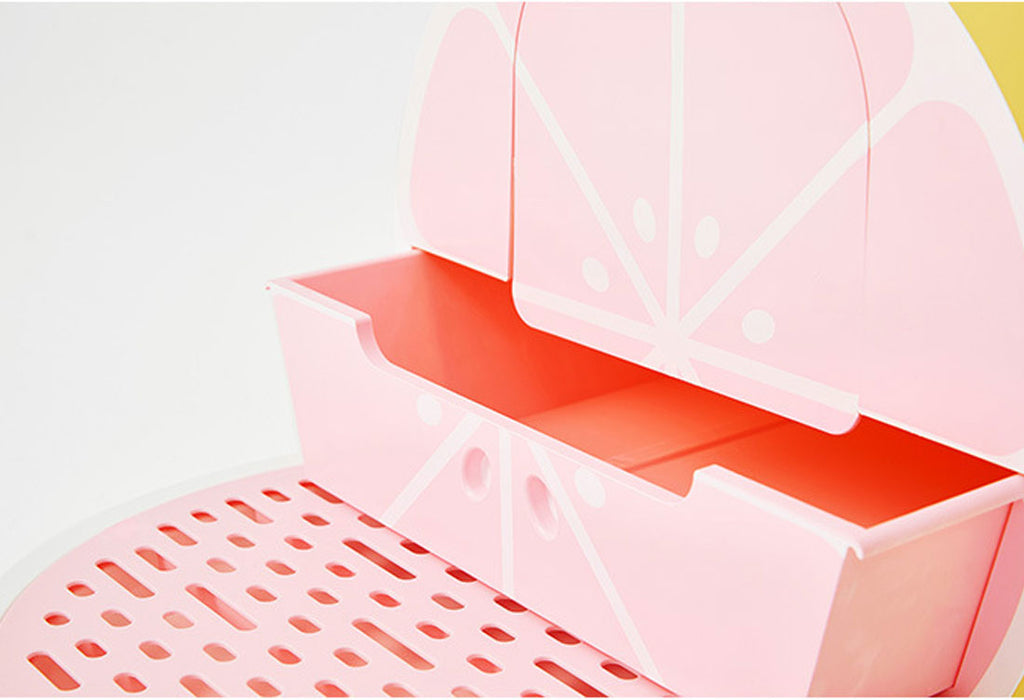 The Vetreska Fruity Kitty Kove presents the shape of lime/grapefruit/watermelon with the fresh and bright colour scheme, which makes the cat litter box not only a toilet but a visually appealing home decoration that perfectly adorns the living space.