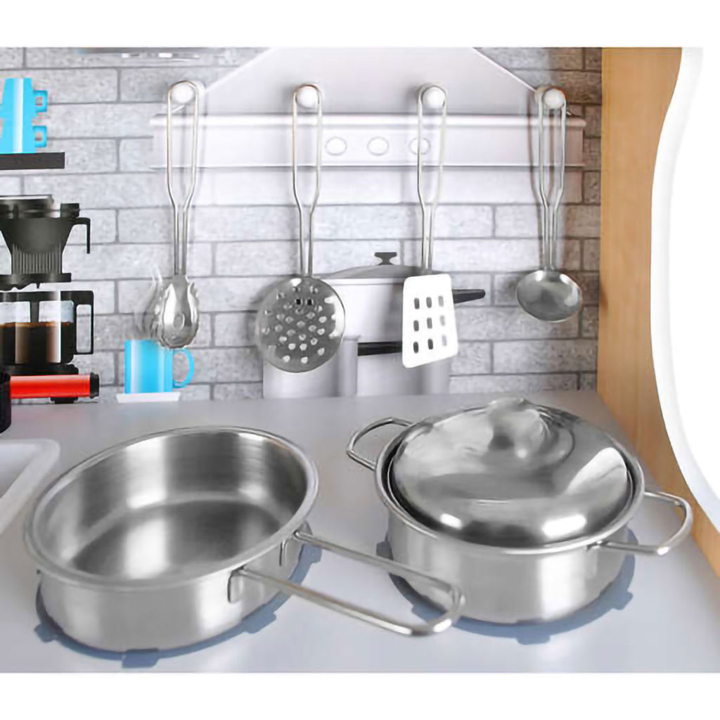 This toddler kitchen playset comes with a cordless phone, spoons & spatula, pan and pot. All the accessories and even other items can be put orderly in the diverse storage space, which will help kids to cultivate the good habit of sorting and organizing.