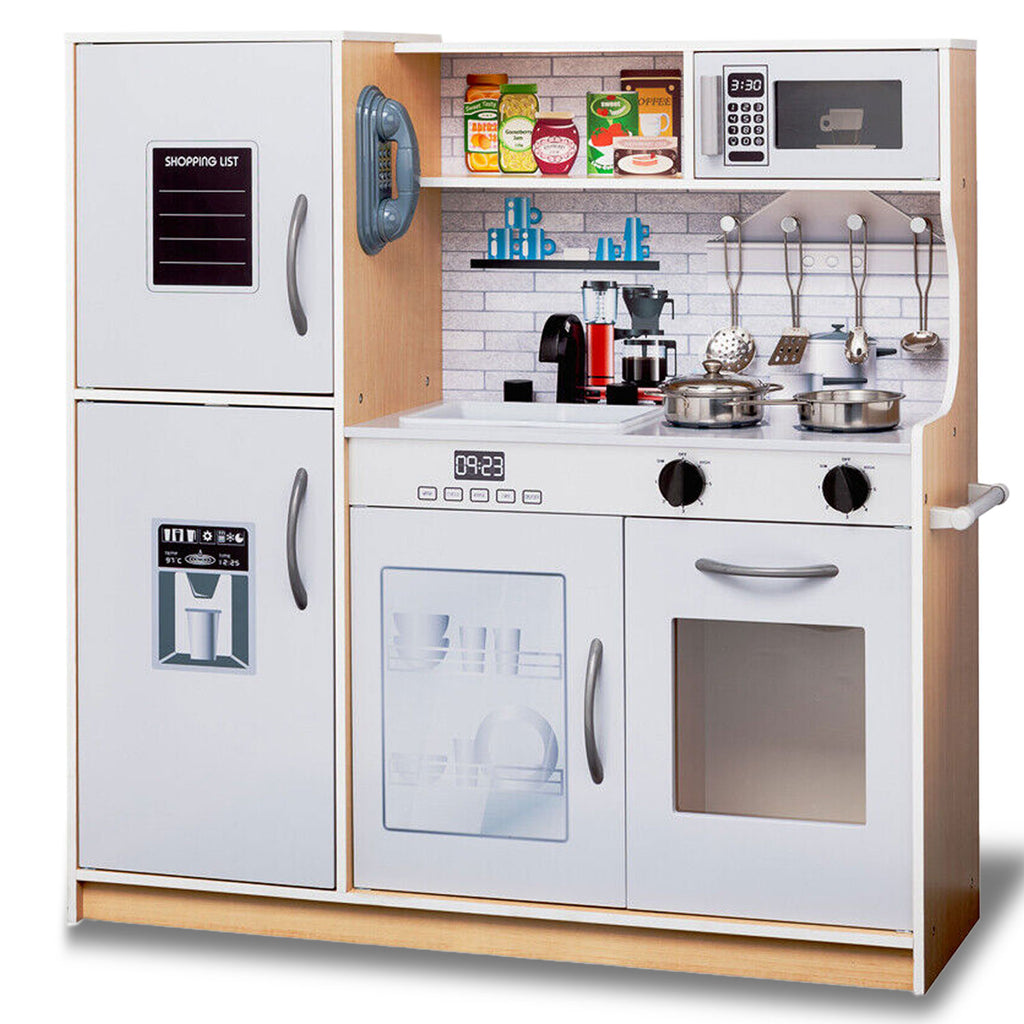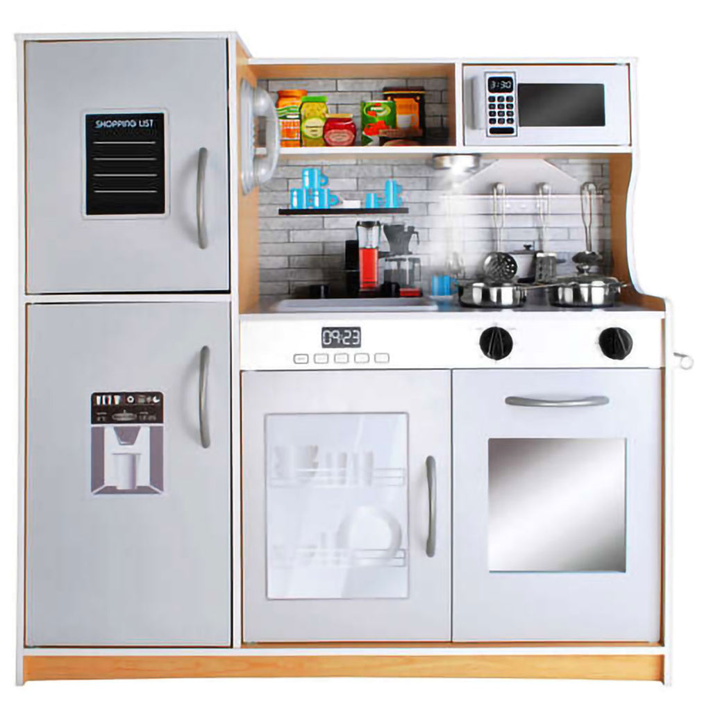 With a built-in blackboard, this kids kitchen playset allows kids to write down the menu today! Stylish backsplash with realistic microwave, fridge, freezer, and dishwasher adds a modern appeal and perfect gift for kids.