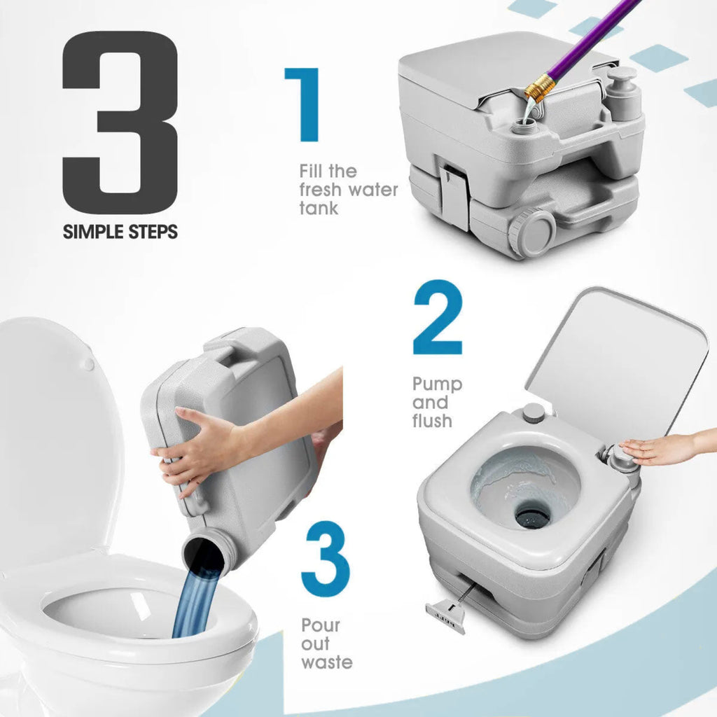 Make your journey worry-free with this 20L Portable Toilet Camping Travel Mobile Porta Potty. Thanks to the high-density polyethylene structure, the travel potty is lightweight yet sturdy for years of use. Completely self-contained, this travel toilet does not require any external water or power supply. Adopting piston pump flush and double flush designs, the portable toilet for camping is composed of a 12L fresh water tank to provide up to 50 times of thorough flushes and a 20L waste holding tank which is easily detached and emptied. A double-sealed drain valve is included to prevent leakage and odour. Compact and easy to transport, the mobile toilet boasts of impressive versatility and amazing practicality so that it can not only be used for camping, off-road driving, fishing and boating but also used as an emergency toilet for hospitals and aged care spots. The best portable toilet is ideal for all seasons and detachable for easy storage and cleaning.