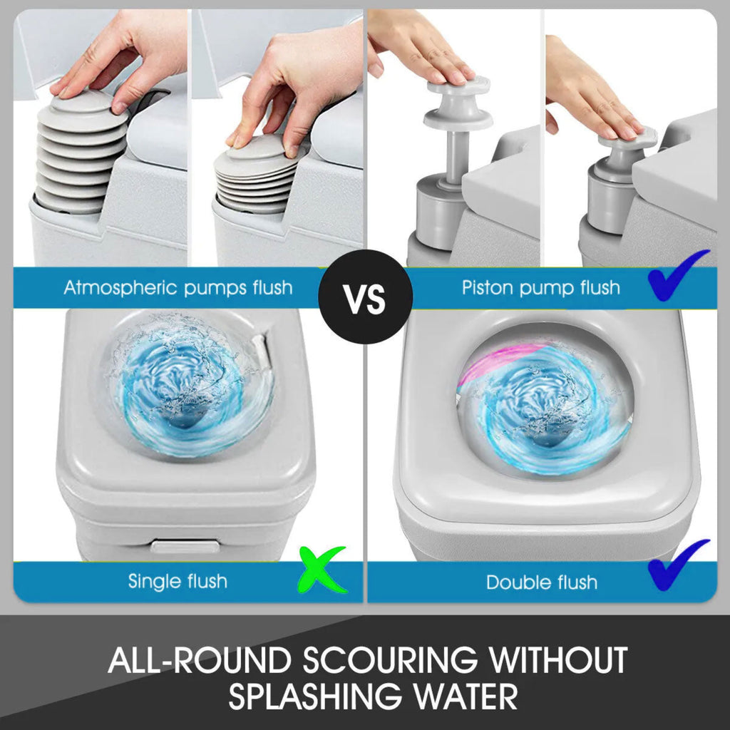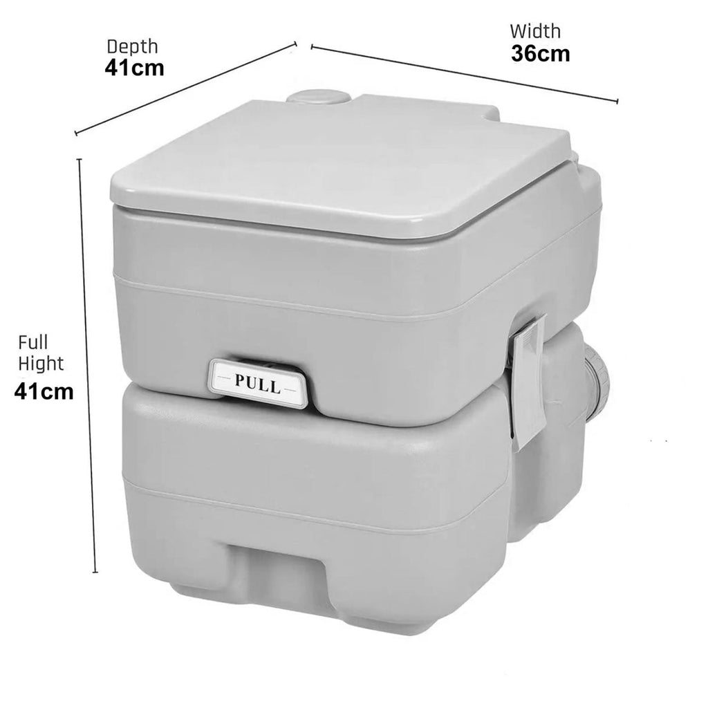 Make your journey worry-free with this 20L Portable Toilet Camping Travel Mobile Porta Potty. Thanks to the high-density polyethylene structure, the travel potty is lightweight yet sturdy for years of use. Completely self-contained, this travel toilet does not require any external water or power supply. Adopting piston pump flush and double flush designs, the portable toilet for camping is composed of a 12L fresh water tank to provide up to 50 times of thorough flushes and a 20L waste holding tank which is easily detached and emptied. A double-sealed drain valve is included to prevent leakage and odour. Compact and easy to transport, the mobile toilet boasts of impressive versatility and amazing practicality so that it can not only be used for camping, off-road driving, fishing and boating but also used as an emergency toilet for hospitals and aged care spots. The best portable toilet is ideal for all seasons and detachable for easy storage and cleaning.